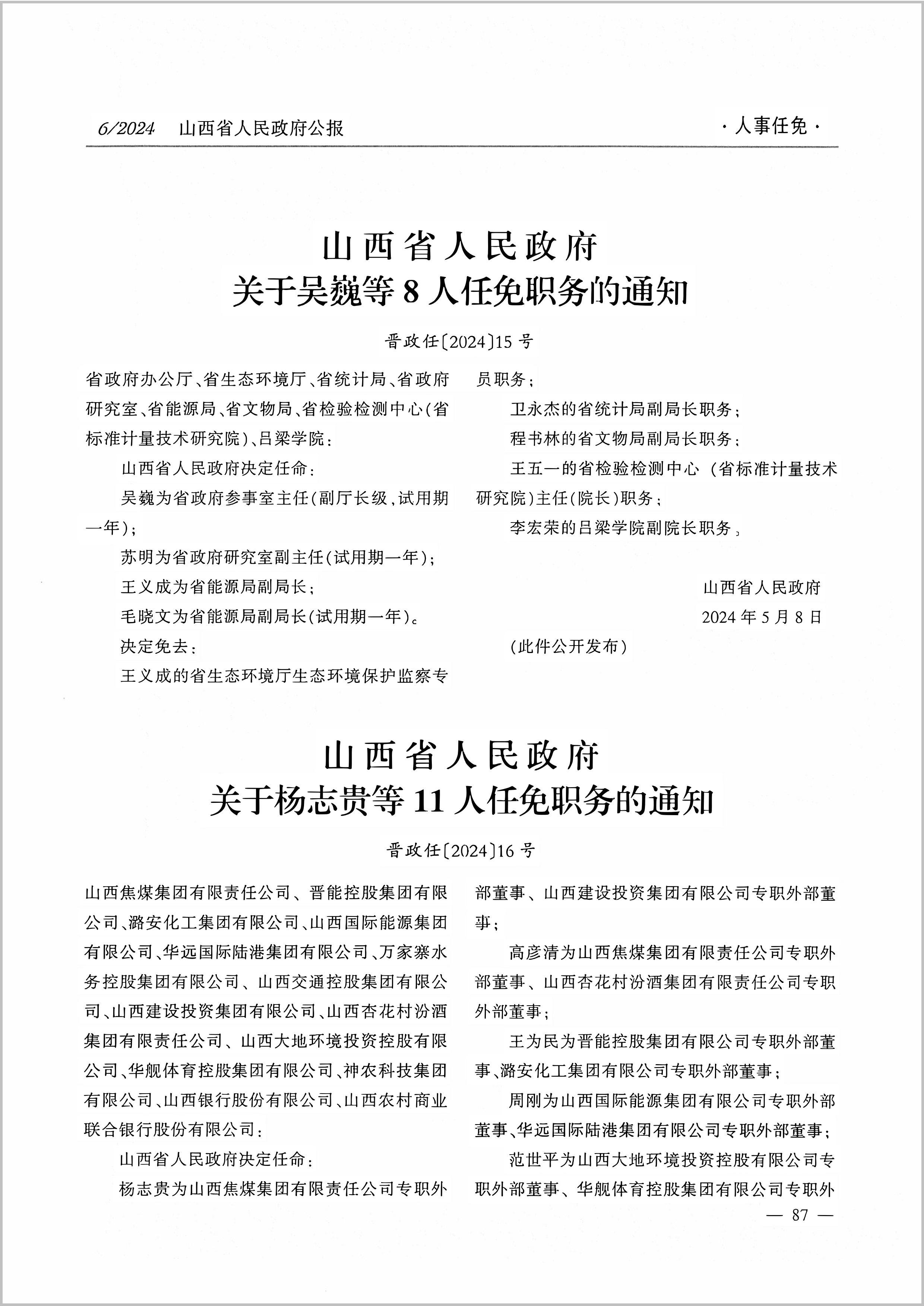 決定免去——范世平的萬家寨水務控股集團有限公司副董事長、董事職務;肖亞寧的山西焦煤、晉能控股集團有限公司專職外部董事職務;楊清民的山西國際能源、神農(nóng)科技集團有限公司專職外部董事職務;史峰的山西大地環(huán)境投資控股、華艦體育控股集團有限公司專職外部董事職務。