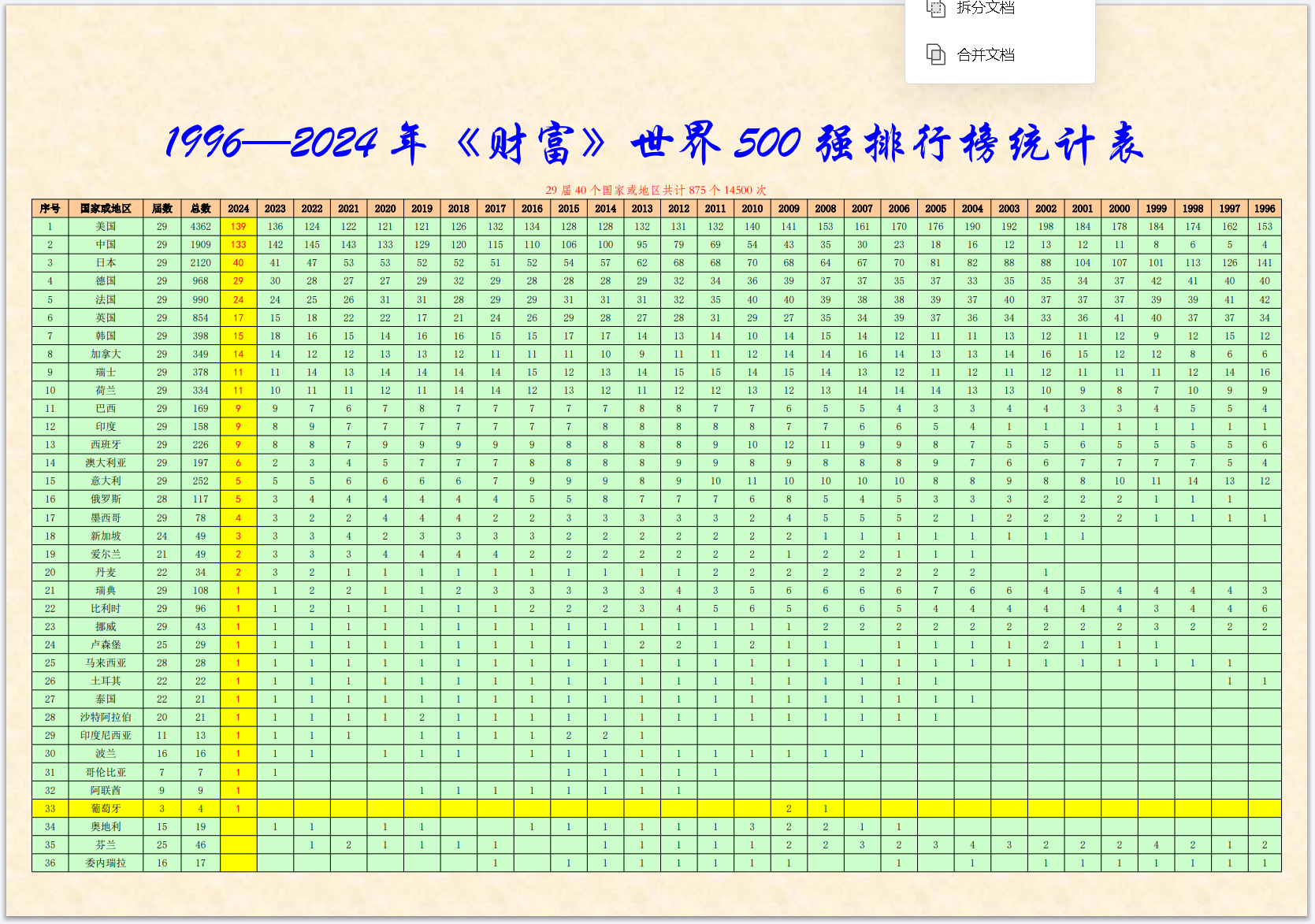 《財富》世界500強雜志社,從1995年開始在中國登陸,已經(jīng)連續(xù)舉辦了29期中文版的世界500強排名榜,我收集到的完整資料,僅缺第一期1995年的全榜單,所以,目前只能編輯二十八期。即1996-2023年《財富》世界500強和中國上榜企業(yè)的名單,待日后有機會的話再補齊。