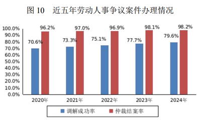 全年全國各級勞動人事爭議調解組織和仲裁機構共辦理勞動人事爭議案件 425.7 萬涉及勞動者 454.9 萬人。全年辦結爭議案件 415.6 萬件,結案金額 934.7 億元。全年勞動人事爭議調解成功率 79.6%,仲裁結案率 98.2%,仲裁終結率73.7%。