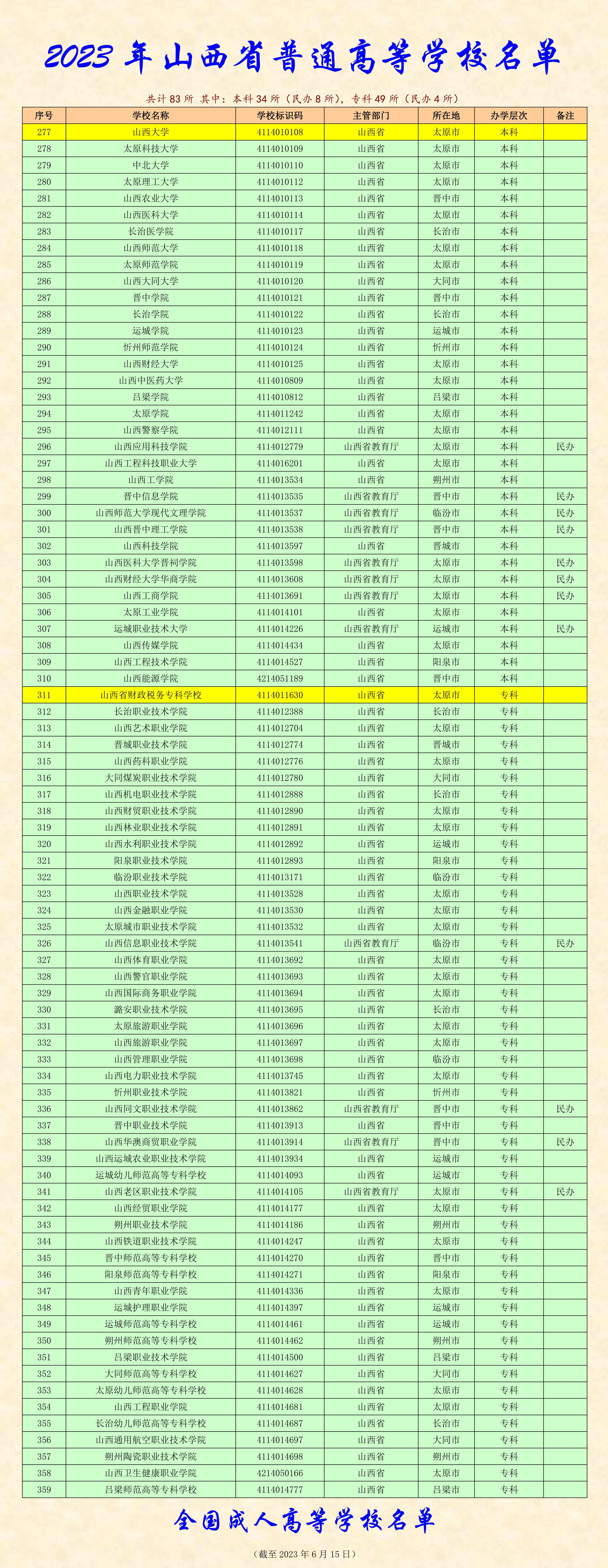截至2023年6月15日,全國高等學校共計3072所,其中:普通高等學校2820所,含本科院校1275所、高職(專科)院校1545所;成人高等學校252所。本名單未包含港澳臺地區(qū)高等學校。
