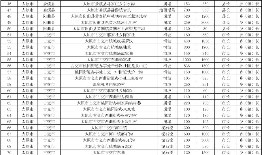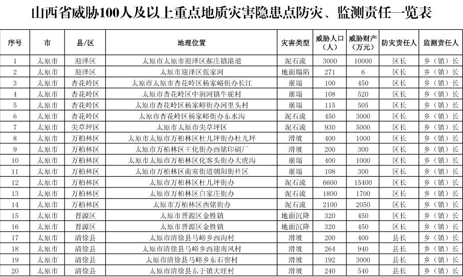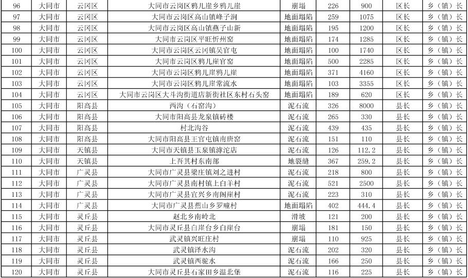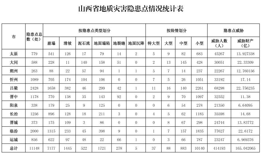 本報太原6月2日訊(記者王佳麗)省自然資源廳6月1日印發(fā)的《山西省2023年度地質災害防治方案》(以下簡稱《方案》),劃定了晉西黃土高原、太原西山—汾西—霍州—鄉(xiāng)寧—河津礦區(qū)、太原東山—陽泉—潞安—晉城—沁水礦區(qū)、嵐縣—靜樂礦區(qū)共4個崩塌、滑坡地質災害重點防治區(qū)。