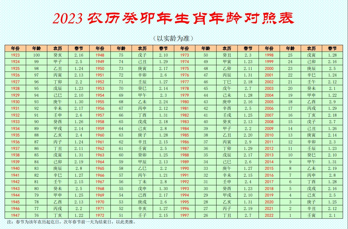 2023農(nóng)歷癸卯年生肖年齡對照表
