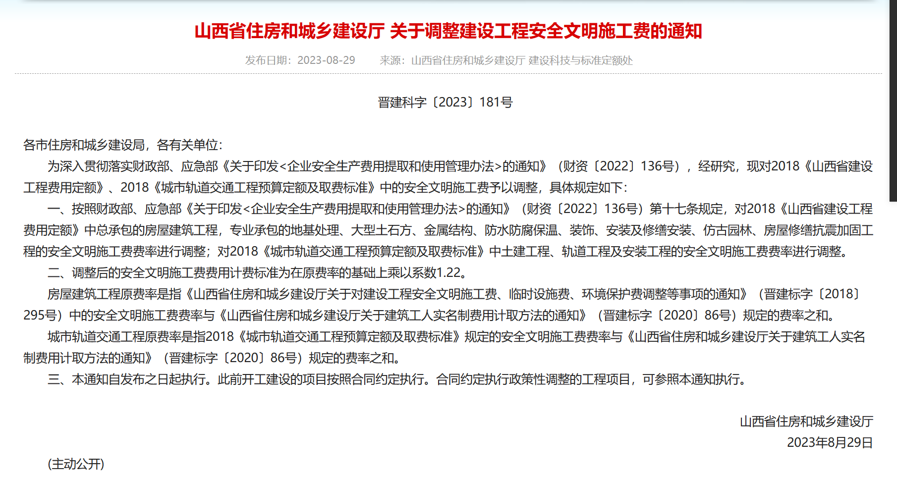 【行業(yè)動(dòng)態(tài)】山西省住房和城鄉(xiāng)建設(shè)廳 關(guān)于調(diào)整建設(shè)工程安全文明施工費(fèi)的通知