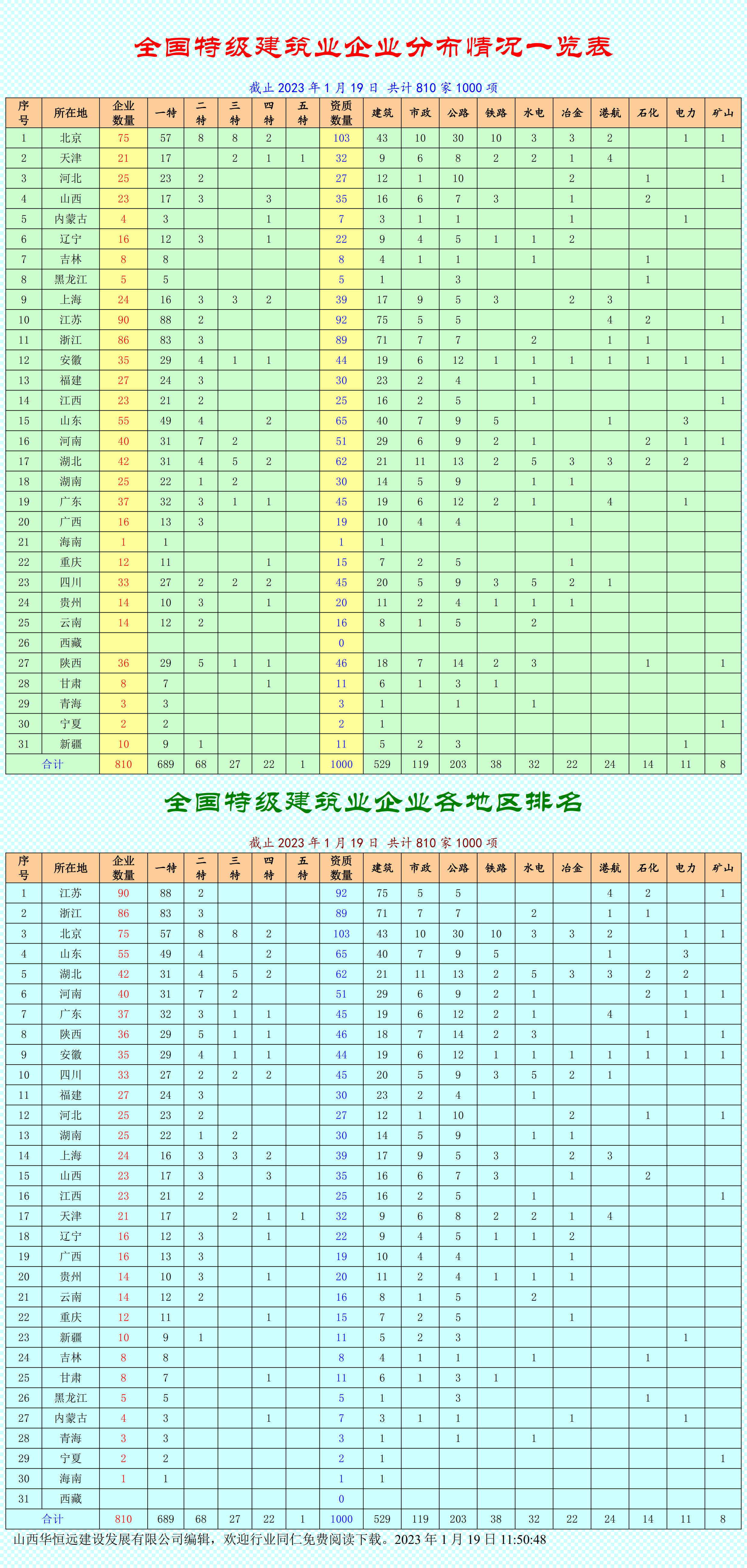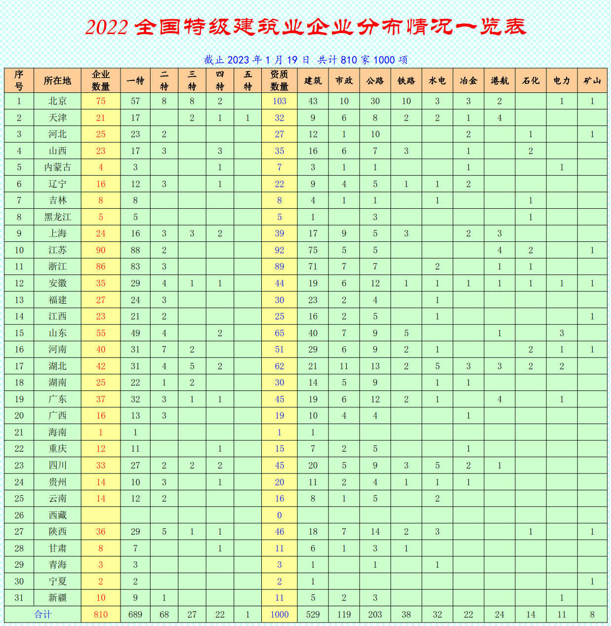 關(guān)注核準(zhǔn)特級(jí)資質(zhì)企業(yè),是我最大的事,堅(jiān)持不懈,持之以恒,一以貫之,已經(jīng)成為生命的重要組成部分!為什么?對(duì)行業(yè)的熱愛(ài),對(duì)企業(yè)的忠誠(chéng),還有比這大的事情嗎?!不但關(guān)注,還要付諸行動(dòng),讓更多的人關(guān)注,更多的人參與,更多的人行動(dòng),這是我義無(wú)反顧和責(zé)無(wú)旁貸的責(zé)任與使命,讓大家輕松愉快,一目了然,就能看清楚建筑企業(yè)的佼佼者,行業(yè)翹楚,領(lǐng)軍大公司是哪個(gè)省,誰(shuí)是第一!810家,1000項(xiàng)資質(zhì),多么吉祥的數(shù)字呀!