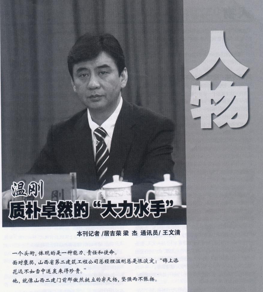 2007年1月,由于在設(shè)計(jì)公司工作的突出業(yè)績,溫剛臨危受命,被山西建筑工程(集團(tuán))總公司任命為山西省第二建筑工程公司總經(jīng)理。