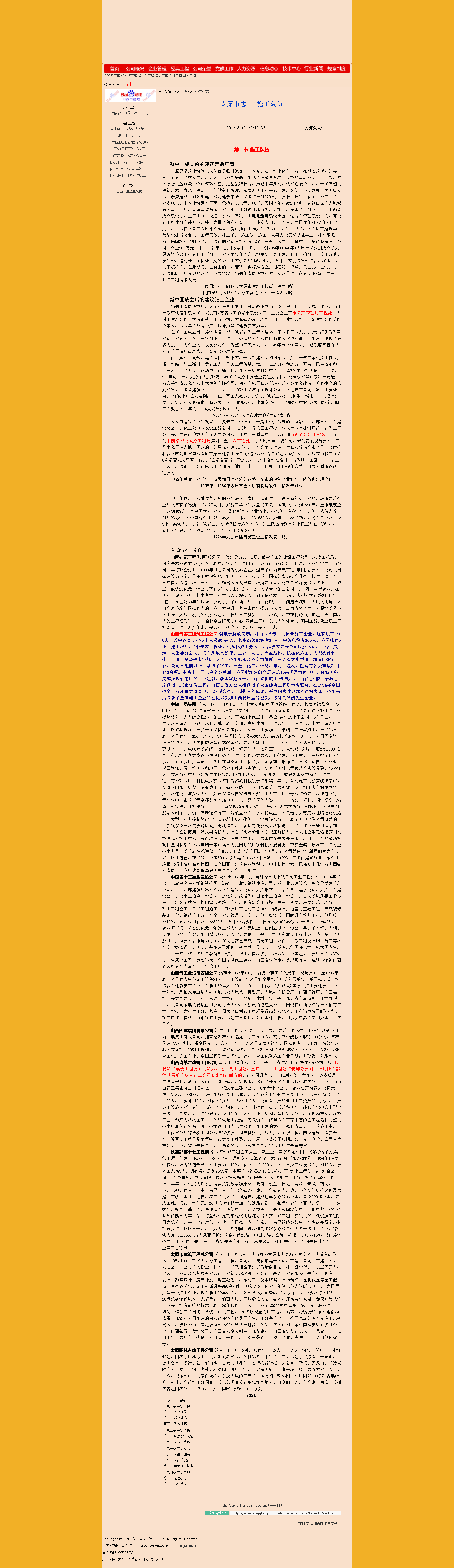 山西省第二建筑工程公司 創(chuàng)建于解放初期,是山西省最早的國營施工企業(yè)?,F(xiàn)有職工5400人,其中各類專業(yè)技術(shù)人員900余人,其中高級(jí)職稱者35人,中級(jí)職稱者300人。公司現(xiàn)有6個(gè)土建工程處、2個(gè)安裝工程處、機(jī)械化施工分公司、高級(jí)裝飾分公司以及北京、上海、威海、同朔等分公司。擁有從地基處理、土建、安裝、高級(jí)裝飾、機(jī)械化施工、大型構(gòu)件制作、運(yùn)輸、吊裝等專業(yè)施工隊(duì)伍。公司機(jī)械裝備實(shí)力雄厚,有各類大中型施工機(jī)具900余臺(tái)。公司自組建以來,承擔(dān)了軍工、冶金、化工、輕紡、建材、院校、醫(yī)院等各類建設(shè)項(xiàng)目140余項(xiàng)。中共十一屆三中全會(huì)以后,公司所承建的高層建筑40余項(xiàng)及河西電廠、晉城礦務(wù)局成莊煤礦電廠等工業(yè)建筑,獲國家建設(shè)部、山西省優(yōu)質(zhì)工程8項(xiàng)。北京百貨大樓百子灣倉庫獲得北京市優(yōu)質(zhì)工程,山西省委辦公大樓獲得了全國建筑工程質(zhì)量魯班獎(jiǎng)。在1994年全國住宅工程質(zhì)量大檢查中,以3項(xiàng)合格、2項(xiàng)優(yōu)良的成果,受到國家建設(shè)部的通報(bào)表揚(yáng)。公司先后榮獲了全國施工企業(yè)管理優(yōu)秀獎(jiǎng)和山西省質(zhì)量管理獎(jiǎng)。被評(píng)為省級(jí)先進(jìn)企業(yè)。