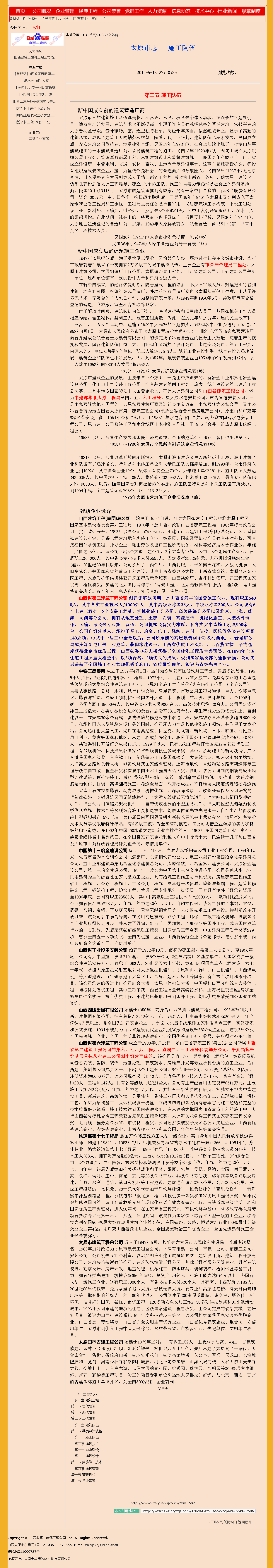1949年太原解放后,為了盡快復(fù)工復(fù)業(yè),醫(yī)治戰(zhàn)爭創(chuàng)傷,逐步進(jìn)行社會(huì)主義城市建設(shè),當(dāng)年市政府就著手建立了一支擁有2萬名職工的城市建設(shè)隊(duì)伍。主要企業(yè)有市公產(chǎn)管理局工程處、太原市建筑公司、太原鋼鐵廠工程公司、太原鐵路局工程處、山西省建筑公司、工礦建筑公司等6個(gè)單位,這些單位都有一定的設(shè)計(jì)力量和建筑安裝力量。