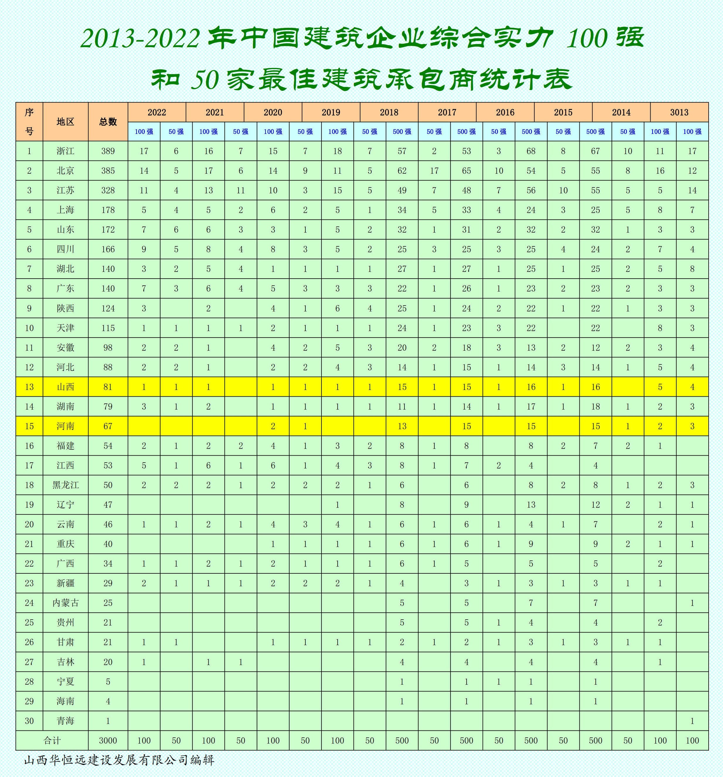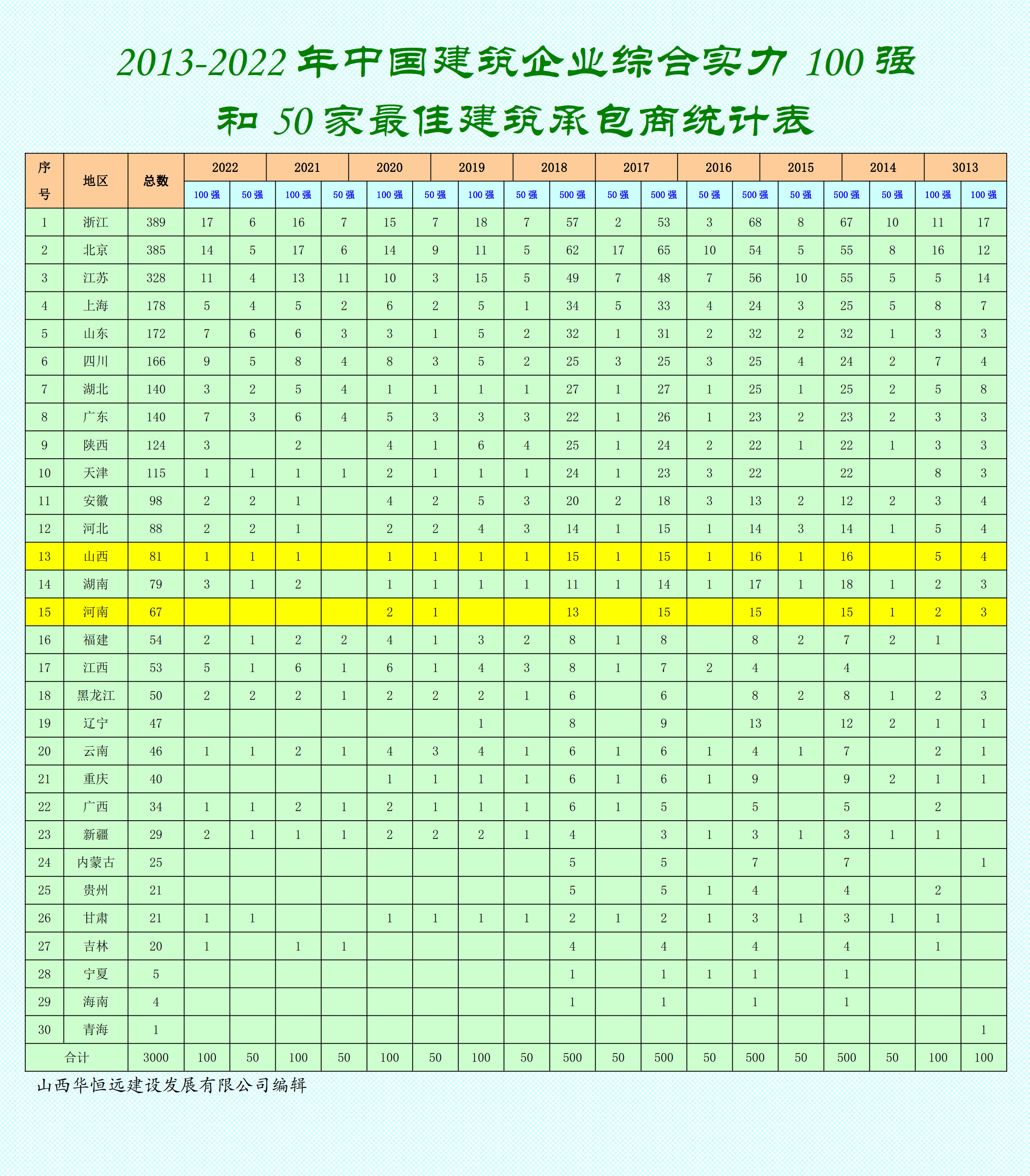 2013-2022年中國建筑企業(yè)綜合實力100強(qiáng)和50家最佳建筑承包商排行榜?