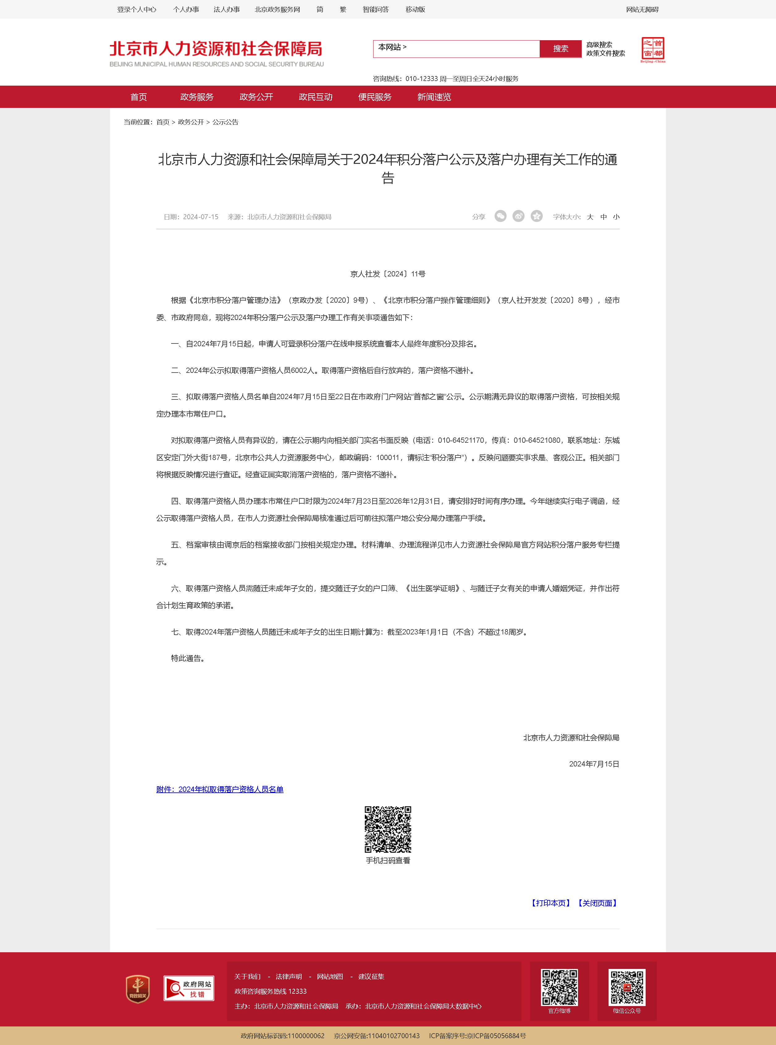 15日起北京市積分落戶工作進(jìn)入公示及落戶辦理階段,擬取得落戶資格人員名單于7月15日至7月22日,在北京市政府門戶網(wǎng)站“首都之窗”公示,接受社會監(jiān)督。積分落戶申請人可登錄積分落戶在線申報(bào)系統(tǒng)查看本人最終年度積分及排名。經(jīng)公示無異議的,取得落戶資格,申請人可在2024年7月23日至2026年12月31日期間,按照有關(guān)規(guī)定辦理落戶手續(xù)。