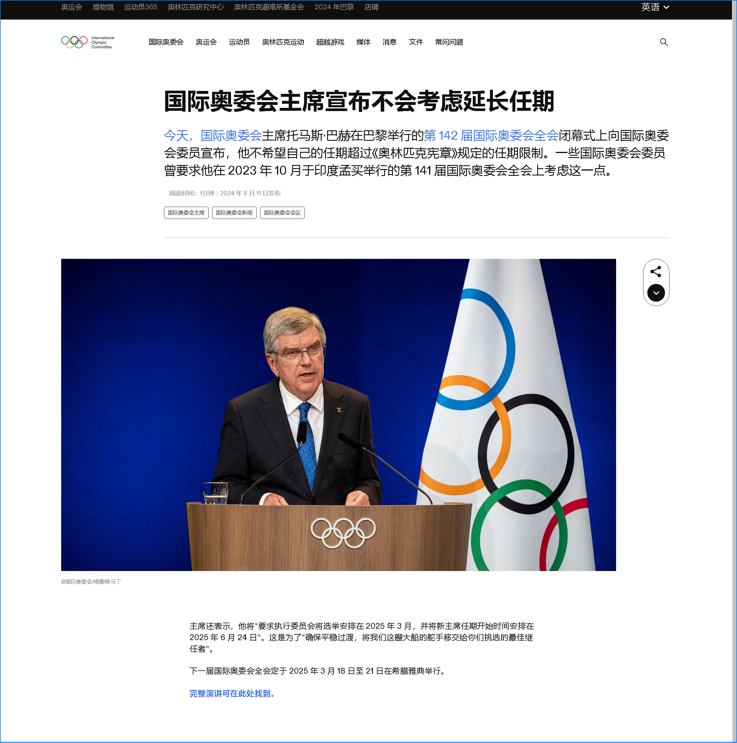 北京時間8月11日,國際奧委會第145屆會議上,現(xiàn)任國際奧委會主席巴赫宣布將不再連任。