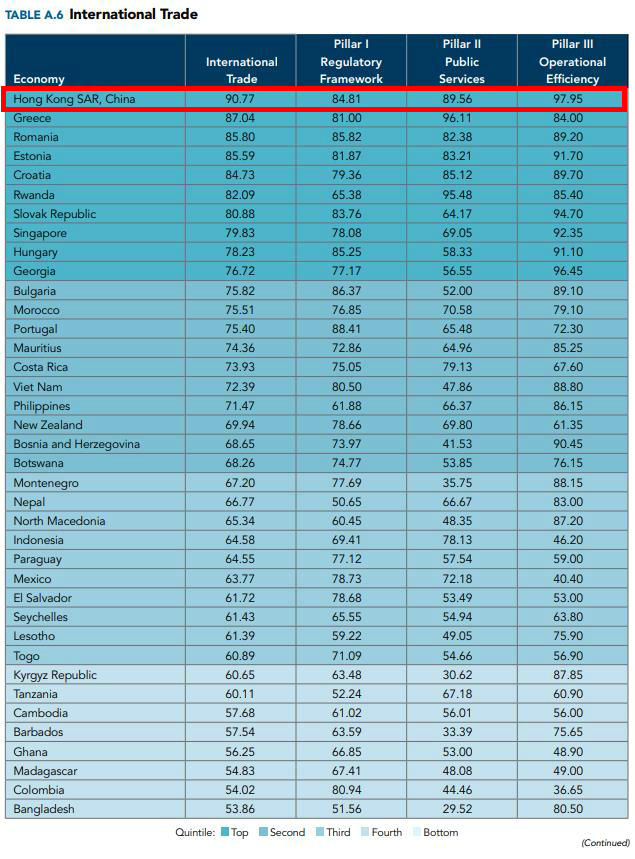 報告屬試行性質(zhì),以十項指標及三個維度比較各個經(jīng)濟體在營商環(huán)境方面的整體表現(xiàn)。在十項指標當中,香港獲最高分數(shù)的三項分別是“國際貿(mào)易”(90.77分)、“市場準入”(85.49分)及“市政公用基礎(chǔ)設(shè)施服務”(77.71分)。在三個維度當中,香港在“辦事效率”維度的總體得分是78.52,排名第五。