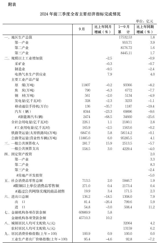 總的來看,前三季度全省經(jīng)濟(jì)運(yùn)行保持穩(wěn)定恢復(fù)態(tài)勢(shì)。尤其是進(jìn)入三季度以來,隨著一系列宏觀政策成效逐步顯現(xiàn),部分行業(yè)領(lǐng)域呈現(xiàn)積極變化,9月當(dāng)月,全省固定資產(chǎn)投資增速較8月份由負(fù)轉(zhuǎn)正回升4.9個(gè)百分點(diǎn),一般公共預(yù)算收入由負(fù)轉(zhuǎn)正回升16.0個(gè)百分點(diǎn),限額以上消費(fèi)品零售額由負(fù)轉(zhuǎn)正回升1.9個(gè)百分點(diǎn),其中家用電器和音像器材類零售額加快18.2個(gè)百分點(diǎn)。但外部環(huán)境復(fù)雜嚴(yán)峻,經(jīng)濟(jì)穩(wěn)增長(zhǎng)基礎(chǔ)尚不牢固。下一步,全省上下要全面貫徹落實(shí)黨的二十屆三中全會(huì)精神,按照黨中央關(guān)于經(jīng)濟(jì)工作的決策部署,圍繞省委、省政府工作重點(diǎn),堅(jiān)定發(fā)展信心、積極主動(dòng)作為,補(bǔ)足短板弱項(xiàng)、增強(qiáng)內(nèi)生動(dòng)力,強(qiáng)化存量政策和增量政策協(xié)同發(fā)力,鞏固經(jīng)濟(jì)穩(wěn)定運(yùn)行、回升向好基礎(chǔ),努力完成全年經(jīng)濟(jì)社會(huì)發(fā)展目標(biāo)任務(wù)。