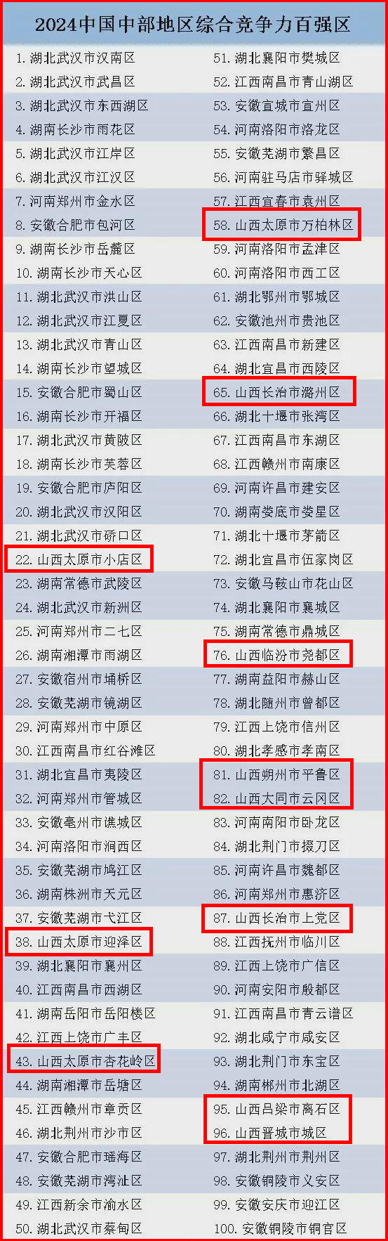 山西上榜的11個區(qū)中,太原市小店區(qū)、迎澤區(qū)、杏花嶺區(qū)、萬柏林區(qū)分別位列第22位、38位、43位、58位。其余為長治市潞州區(qū)、臨汾市堯都區(qū)、朔州市平魯區(qū)、大同市云岡區(qū)、長治市上黨區(qū)、呂梁市離石區(qū)、晉城市城區(qū),分別位列第65位、76位、81位、82位、87位、95位、96位。
