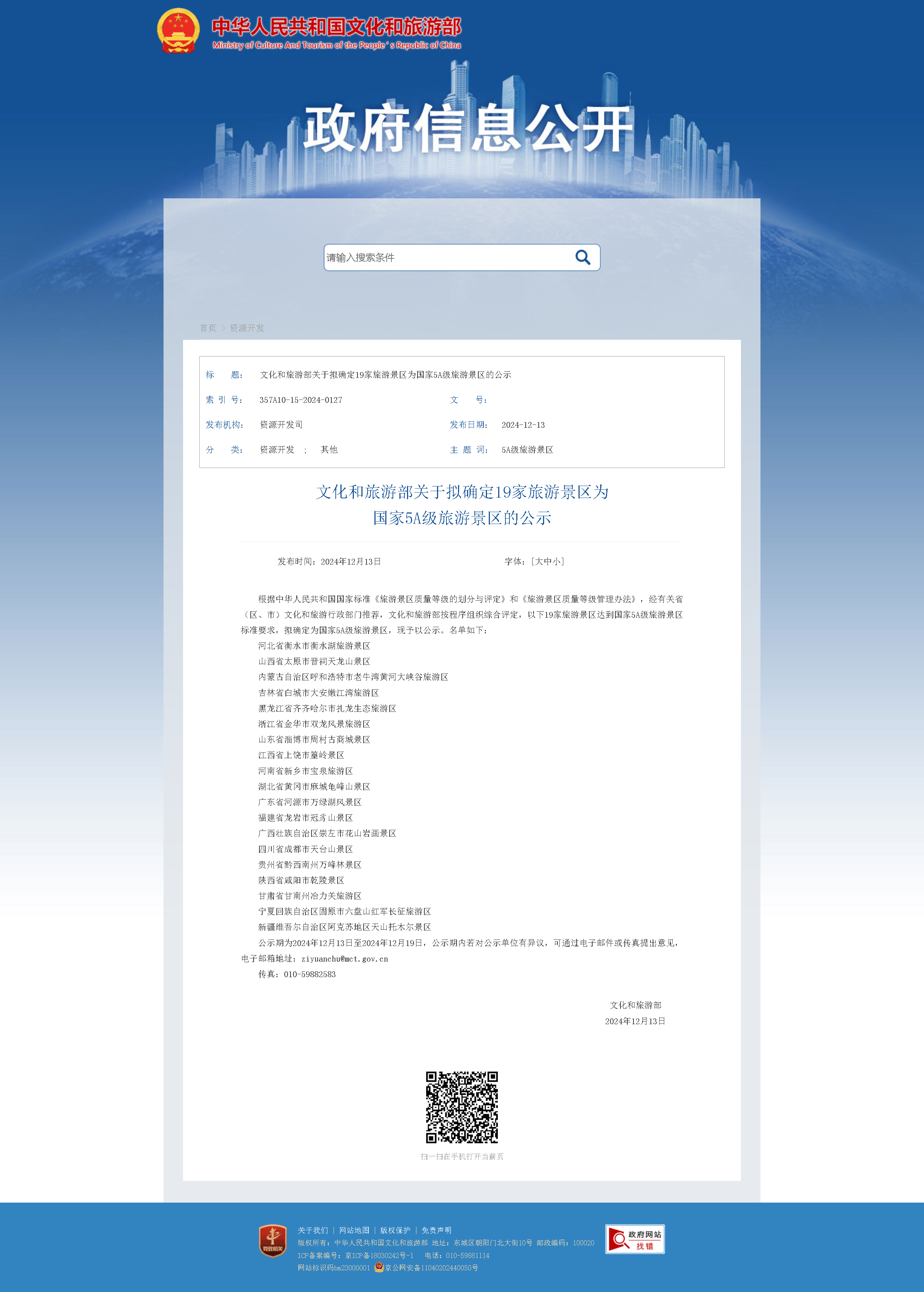 文旅部網(wǎng)站12月13日消息,文化和旅游部發(fā)布關(guān)于擬確定19家旅游景區(qū)為國家5A級旅游景區(qū)的公示: