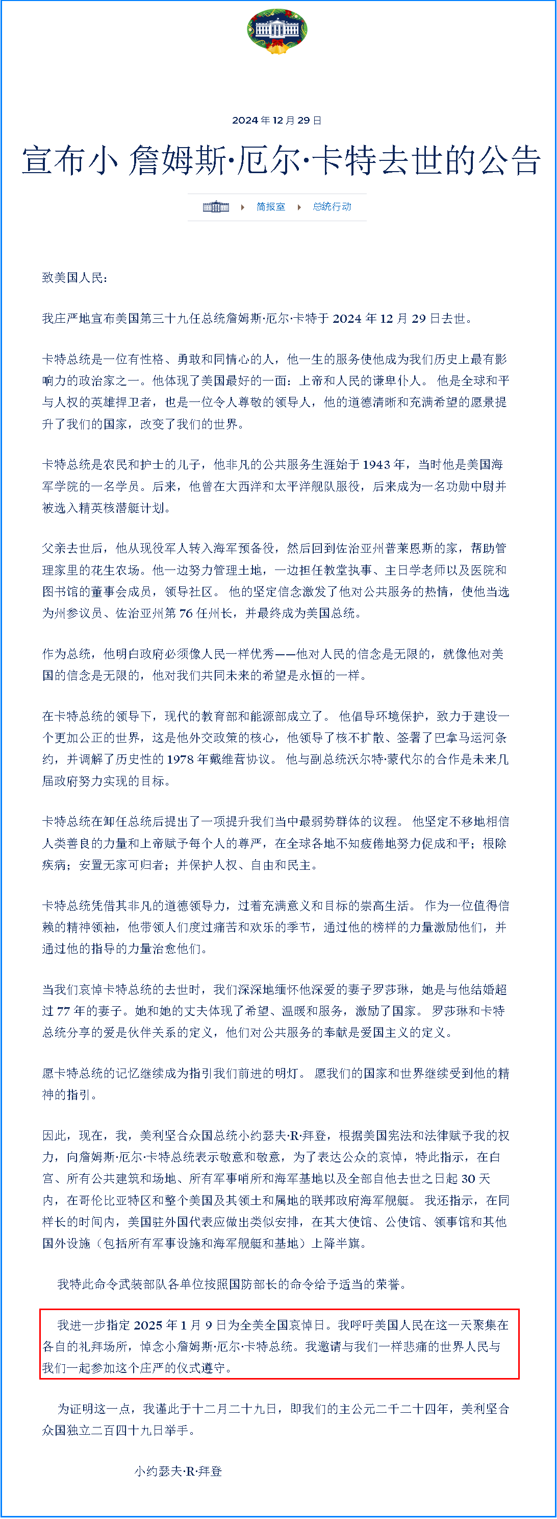 新華社華盛頓12月29日電 美國白宮29日說,2025年1月9日為全國哀悼日,美國總統(tǒng)拜登呼吁美國人民在那一天向前總統(tǒng)吉米·卡特“表達敬意”。