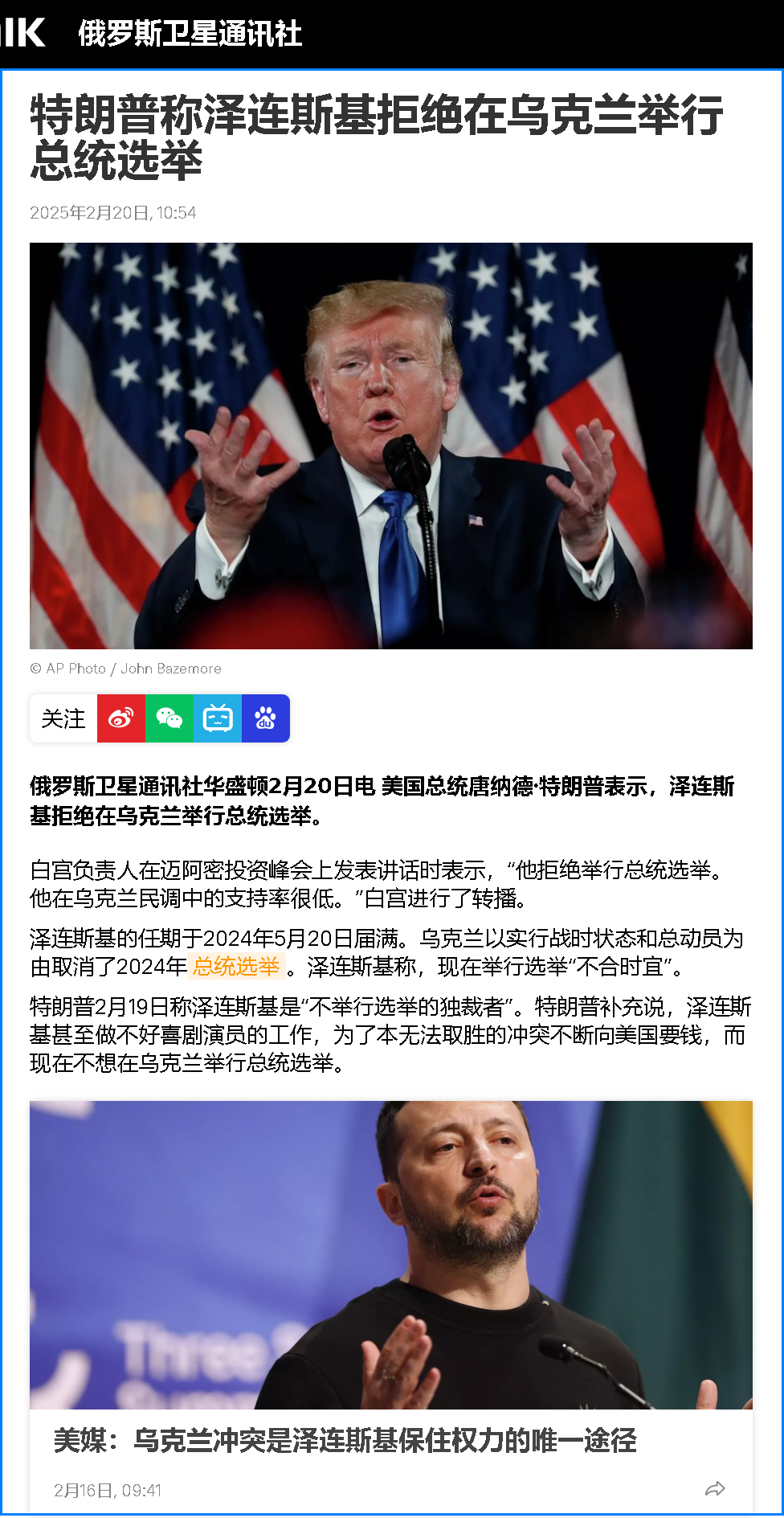 澤連斯基19日又表示,特朗普“不幸地生活在(俄方制造的)虛假信息空間里”,并認(rèn)為特朗普正幫助俄羅斯“打破孤立”。
