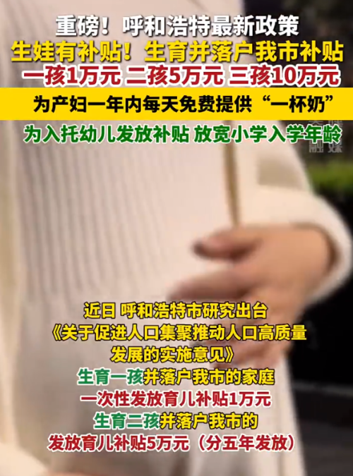 3月13日,內(nèi)蒙古呼和浩特市發(fā)布落實(shí)《關(guān)于促進(jìn)人口集聚推動人口高質(zhì)量發(fā)展的實(shí)施意見》育兒補(bǔ)貼項(xiàng)目實(shí)施細(xì)則及服務(wù)流程。發(fā)放育兒補(bǔ)貼實(shí)施細(xì)則如下:生育一孩一次性發(fā)放育兒補(bǔ)貼1萬元;生育二孩發(fā)放育兒補(bǔ)貼5萬元,按照每年1萬元發(fā)放,直至孩子5周歲;生育三孩及以上發(fā)放育兒補(bǔ)貼10萬元,按照每年1萬元發(fā)放,直至孩子10周歲。