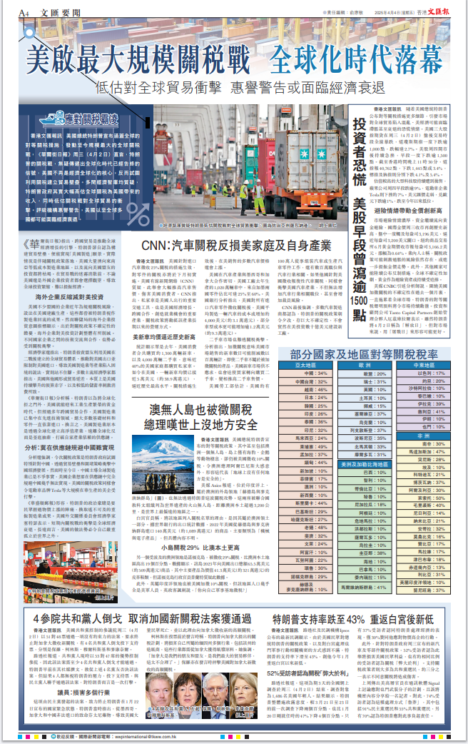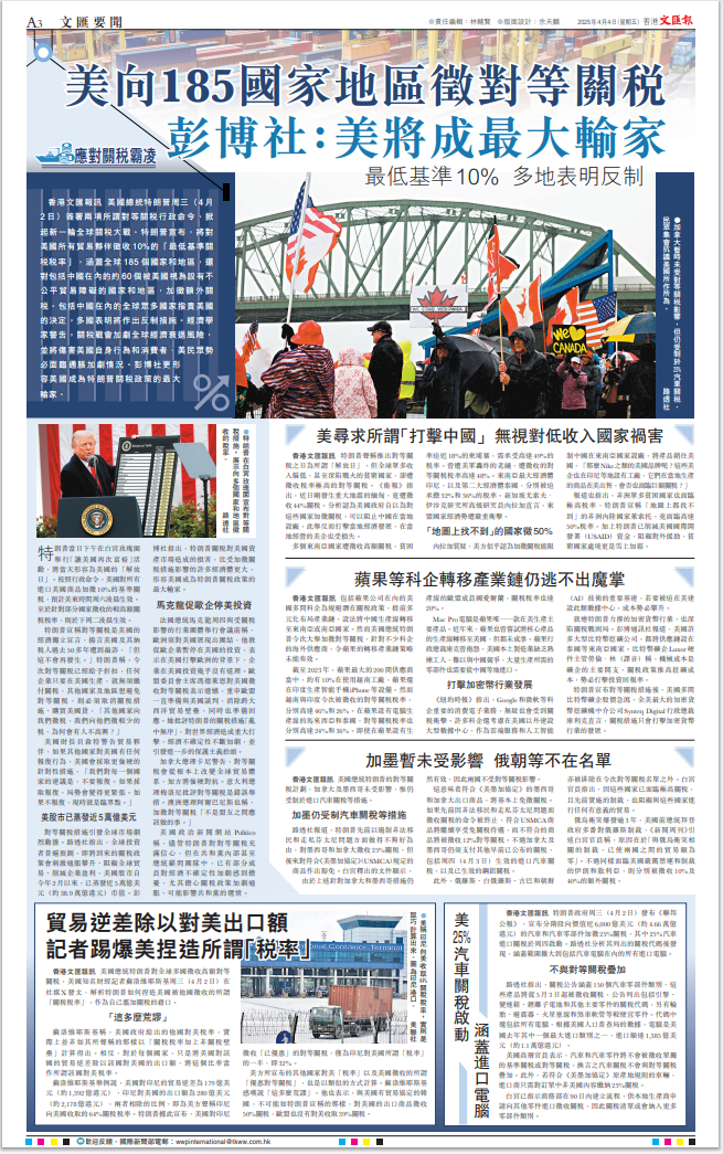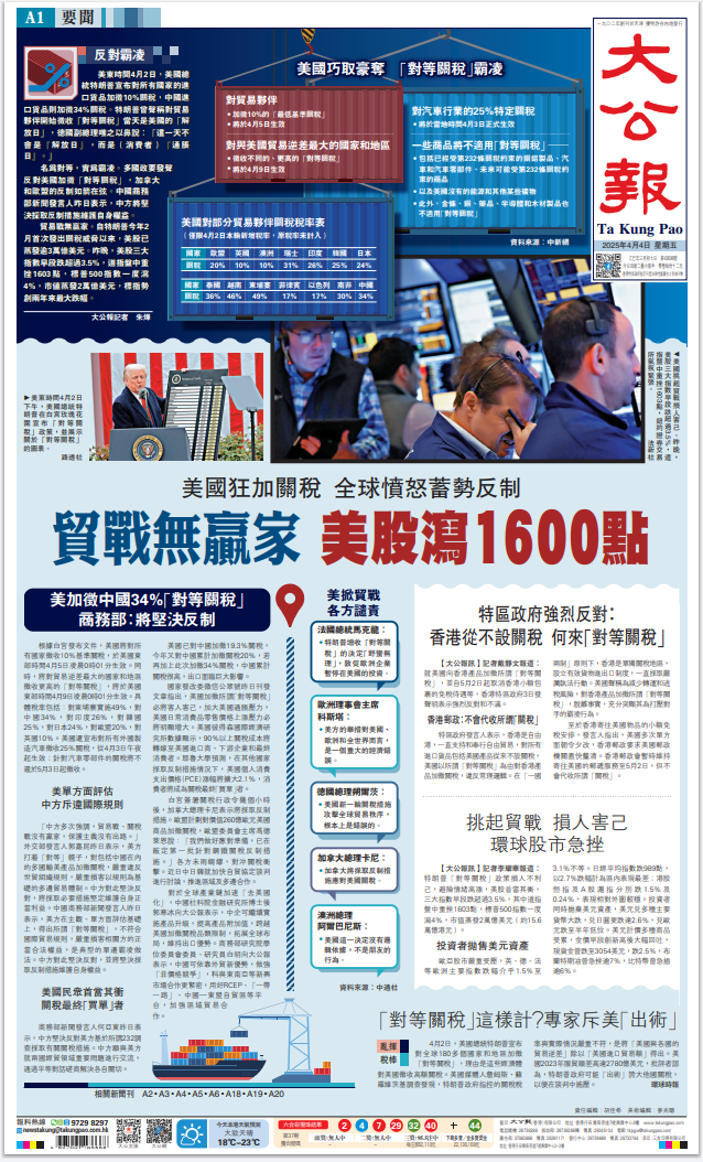 美國總統(tǒng)特朗普昨日發(fā)動史無前例的關(guān)稅戰(zhàn),向全世界主要國家徵收巨額關(guān)稅。此舉進(jìn)一步暴露其霸權(quán)主義的真面目,遭到包括其盟友在內(nèi)所有國家的一致強(qiáng)烈反對。美股昨晚一度大跌1600點(diǎn),足以體現(xiàn)市場的態(tài)度。面對美國的野蠻霸道行徑,中國將採取必要措施堅定維護(hù)自身權(quán)益。對香港特區(qū)來說,挑戰(zhàn)和機(jī)遇並存,既要正視美關(guān)稅戰(zhàn)帶來的衝擊,更要堅定發(fā)展信心,加快融入國家發(fā)展大局,加大開拓新市場的力度,提升應(yīng)對風(fēng)浪的能力。