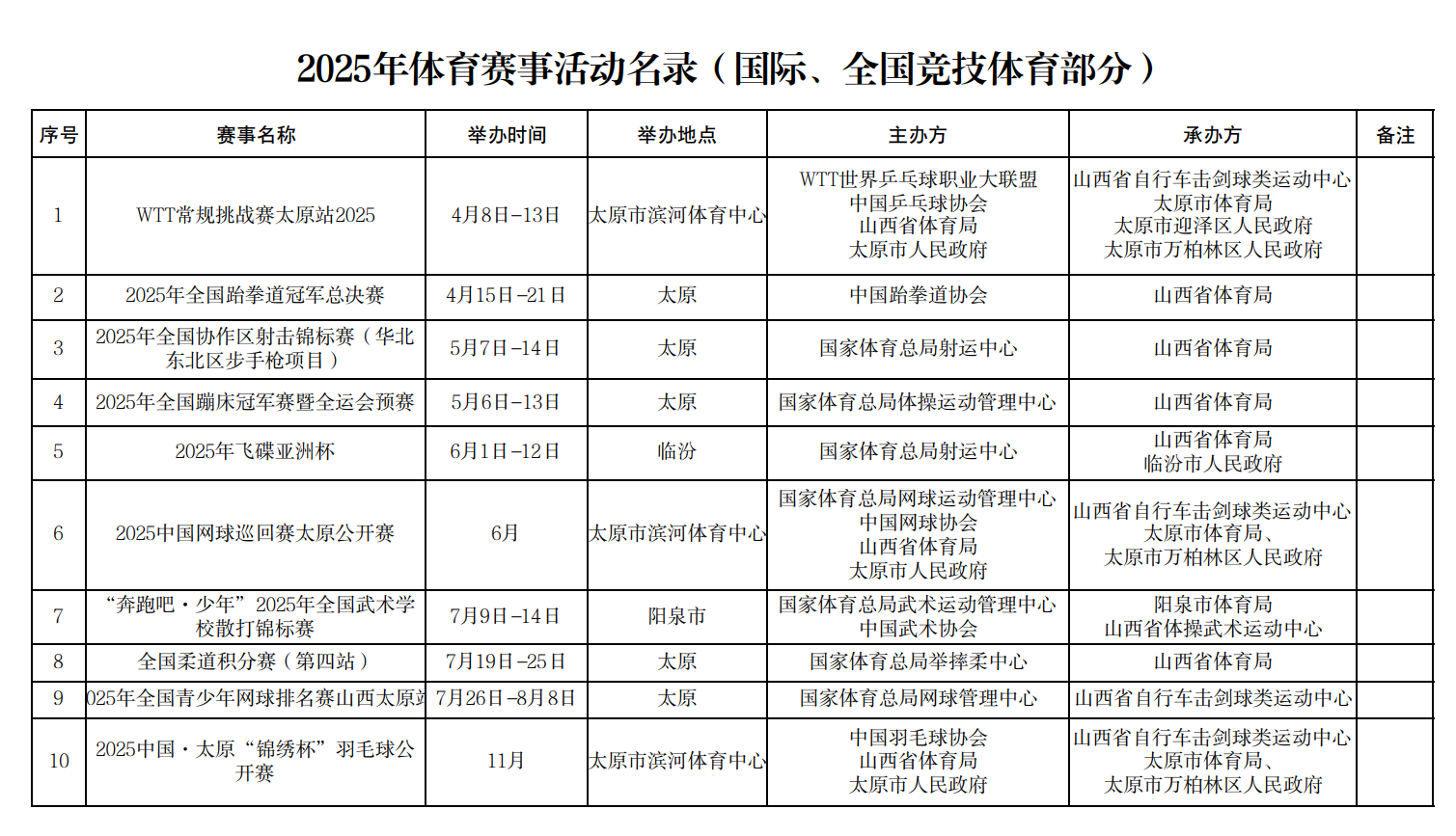 黃河新聞網(wǎng)訊(記者牛牧瑤)近日,山西省體育局印發(fā)《2025年體育賽事活動(dòng)名錄》,匯總了2025年我省各類主要體育賽事,共分三大類,總計(jì)1563項(xiàng)賽事。