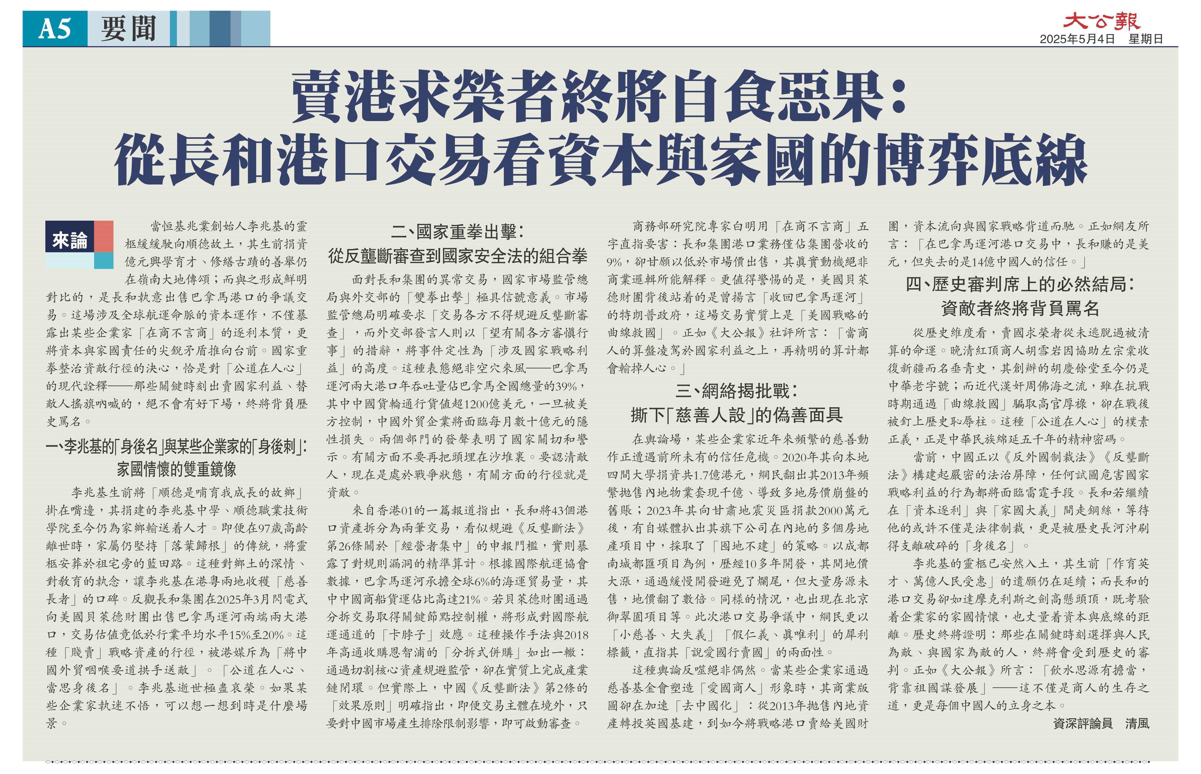 當(dāng)前,中國正以《反外國制裁法》《反壟斷法》構(gòu)建起嚴(yán)密的法治屏障,任何試圖危害國家戰(zhàn)略利益的行為都將面臨雷霆手段。長和若繼續(xù)在「資本逐利」與「家國大義」間走鋼絲,等待他的或許不僅是法律制裁,更是被歷史長河沖刷得支離破碎的「身后名」。