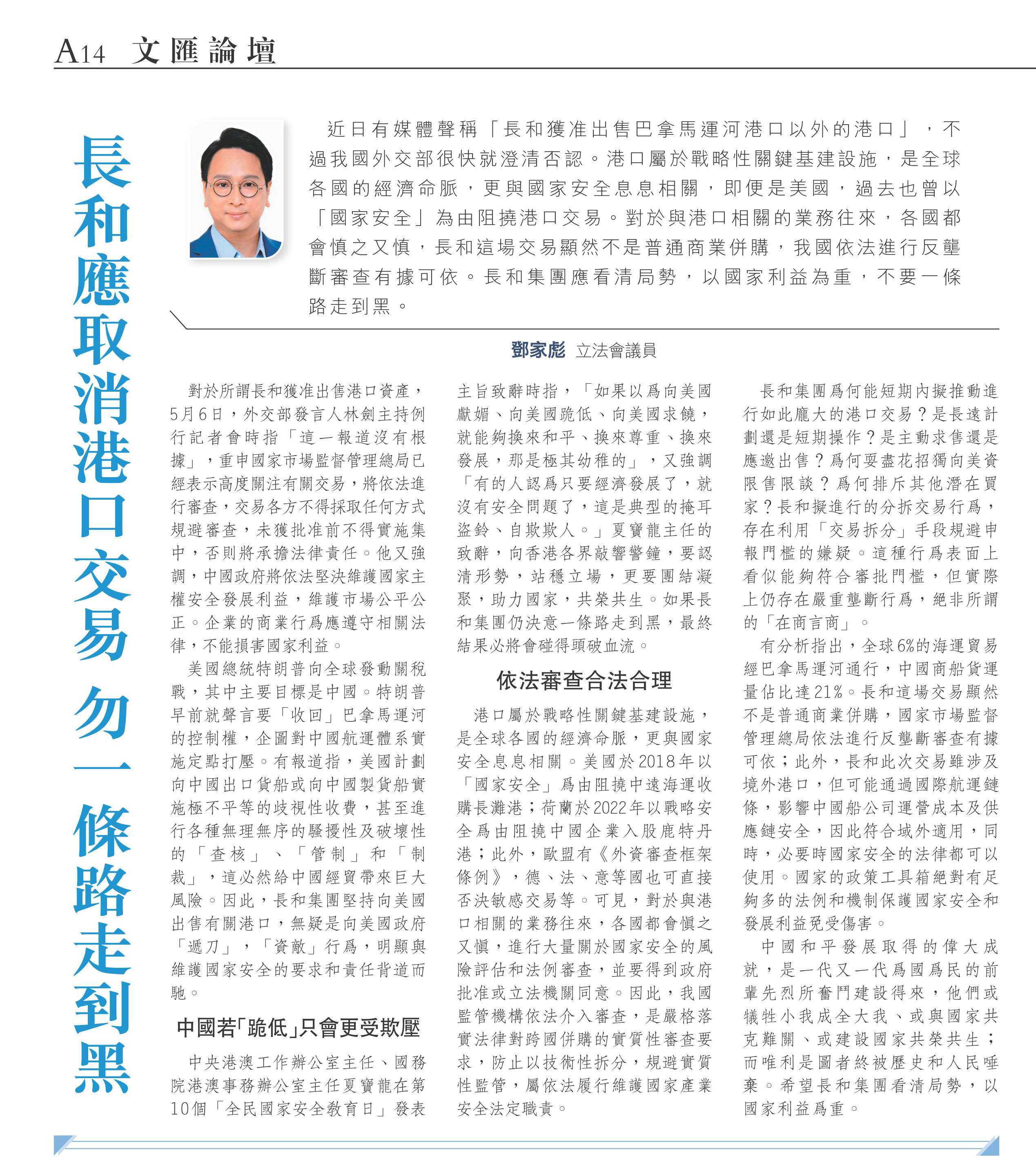 美國總統(tǒng)特朗普向全球發(fā)動(dòng)關(guān)稅戰(zhàn),其中主要目標(biāo)是中國。特朗普早前就聲言要「收回」巴拿馬運(yùn)河的控制權(quán),企圖對中國航運(yùn)體系實(shí)施定點(diǎn)打壓。有報(bào)道指,美國計(jì)劃向中國出口貨船或向中國制貨船實(shí)施極不平等的歧視性收費(fèi),甚至進(jìn)行各種無理無序的騷擾性及破壞性的「查核」、「管制」和「制裁」,這必然給中國經(jīng)貿(mào)帶來巨大風(fēng)險(xiǎn)。因此,長和集團(tuán)堅(jiān)持向美國出售有關(guān)港口,無疑是向美國政府「遞刀」,「資敵」行為,明顯與維護(hù)國家安全的要求和責(zé)任背道而馳。
