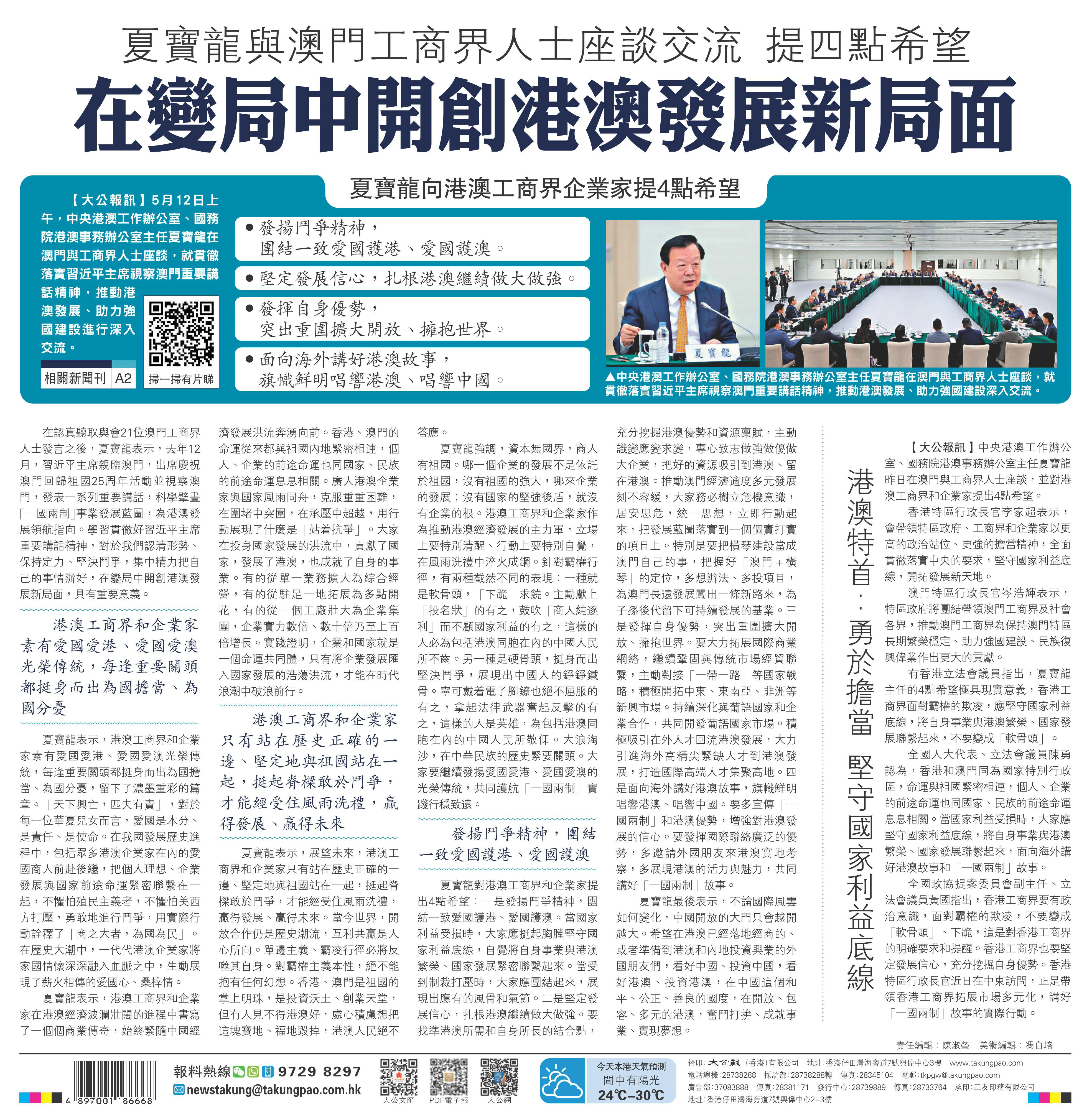 夏寶龍對港澳工商界和企業(yè)家提出4點希望:一是發(fā)揚斗爭精神,團結(jié)一致愛國護港、愛國護澳。當(dāng)國家利益受損時,大家應(yīng)挺起胸膛堅守國家利益底線,自覺將自身事業(yè)與港澳繁榮、國家發(fā)展緊密聯(lián)系起來。當(dāng)受到制裁打壓時,大家應(yīng)團結(jié)起來,展現(xiàn)出應(yīng)有的風(fēng)骨和氣節(jié)。二是堅定發(fā)展信心,扎根港澳繼續(xù)做大做強。要找準港澳所需和自身所長的結(jié)合點,充分挖掘港澳優(yōu)勢和資源稟賦,主動識變應(yīng)變求變,專心致志做強做優(yōu)做大企業(yè),把好的資源吸引到港澳、留在港澳。推動澳門經(jīng)濟適度多元發(fā)展刻不容緩,大家務(wù)必樹立危機意識,居安思危,統(tǒng)一思想,立即行動起來,把發(fā)展藍圖落實到一個個實打?qū)嵉捻椖可稀L貏e是要把橫琴建設(shè)當(dāng)成澳門自己的事,把握好「澳門+橫琴」的定位,多想辦法、多投項目,為澳門長遠發(fā)展闖出一條新路來,為子孫后代留下可持續(xù)發(fā)展的基業(yè)。三是發(fā)揮自身優(yōu)勢,突出重圍擴大開放、擁抱世界。要大力拓展國際商業(yè)網(wǎng)絡(luò),繼續(xù)鞏固與傳統(tǒng)市場經(jīng)貿(mào)聯(lián)系,主動對接「一帶一路」等國家戰(zhàn)略,積極開拓中東、東南亞、非洲等新興市場。持續(xù)深化與葡語國家和企業(yè)合作,共同開發(fā)葡語國家市場。積極吸引在外人才回流港澳發(fā)展,大力引進海外高精尖緊缺人才到港澳發(fā)展,打造國際高端人才集聚高地。四是面向海外講好港澳故事,旗幟鮮明唱響港澳、唱響中國。要多宣傳「一國兩制」和港澳優(yōu)勢,增強對港澳發(fā)展的信心。要發(fā)揮國際聯(lián)絡(luò)廣泛的優(yōu)勢,多邀請外國朋友來港澳實地考察,多展現(xiàn)港澳的活力與魅力,共同講好「一國兩制」故事。