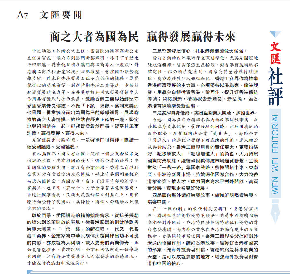 中央港澳工作辦公室主任、國務(wù)院港澳事務(wù)辦公室主任夏寶龍一連六日到澳門考察調(diào)研,昨日下午結(jié)束行程離澳。夏寶龍日前在澳門與工商界人士座談,對港澳工商界和企業(yè)家提出四點(diǎn)希望。當(dāng)前國際形勢復(fù)雜多變,國家和香港發(fā)展面臨不容低估的挑戰(zhàn),夏寶龍?zhí)岢龅拿鞔_希望,對新時期香港工商界進(jìn)一步做好經(jīng)濟(jì)發(fā)展的主力軍、在香港建設(shè)和國家發(fā)展發(fā)揮更大作用具有強(qiáng)烈的啟示意義,激勵香港工商界始終堅守愛國愛港優(yōu)良傳統(tǒng),不做「下跪」求饒、逐利忘義的軟骨頭,勇當(dāng)挺身而出為國為民的錚錚鐵骨,展現(xiàn)胸懷的商之大者情操,始終站在歷史正確的一邊、堅定地與祖國站在一起,挺起脊梁敢于斗爭,經(jīng)受住風(fēng)雨洗禮,贏得發(fā)展、贏得未來。