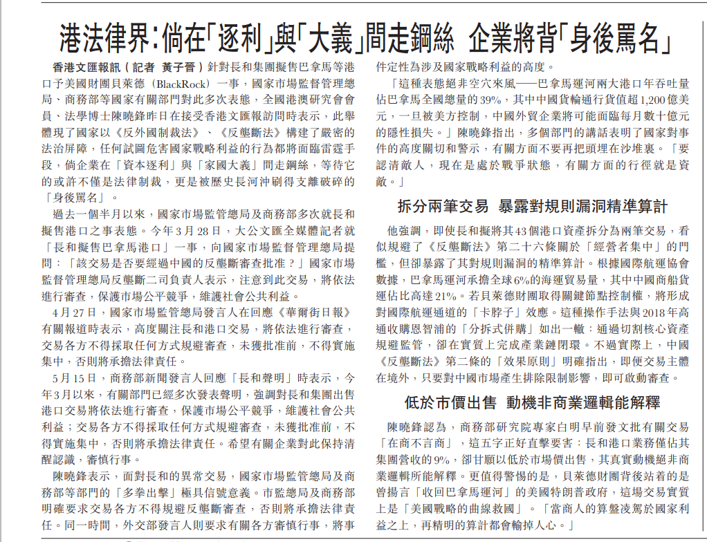 香港文匯報訊(記者黃子晉)針對長和集團(tuán)擬售巴拿馬等港口予美國財團(tuán)貝萊德(BlackRock)一事,國家市場監(jiān)督管理總局、商務(wù)部等國家有關(guān)部門對此多次表態(tài),全國港澳研究會會員、法學(xué)博士陳曉鋒昨日在接受香港文匯報訪問時表示,此舉體現(xiàn)了國家以《反外國制裁法》、《反壟斷法》構(gòu)建了嚴(yán)密的法治屏障,任何試圖危害國家戰(zhàn)略利益的行為都將面臨雷霆手段,倘企業(yè)在「資本逐利」與「家國大義」間走鋼絲,等待它的或許不僅是法律制裁,更是被歷史長河沖刷得支離破碎的「身后罵名」。