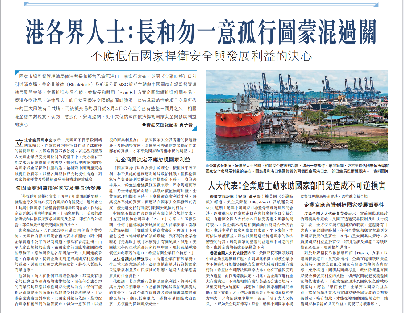 對(duì)于外媒指長(zhǎng)和欲推動(dòng)所謂「Plan B」方案,以繼續(xù)售賣港口,黃英豪指出,企業(yè)在處理戰(zhàn)略資產(chǎn)交易時(shí),應(yīng)當(dāng)全面配合國(guó)家有關(guān)部門的調(diào)查與指導(dǎo),充分溝通,闡明其商業(yè)考量,嚴(yán)格防范危害國(guó)家安全和發(fā)展利益的風(fēng)險(xiǎn),切勿試圖規(guī)避或繞過(guò)國(guó)家的依法審查。 「企業(yè)在處理涉及國(guó)家安全的戰(zhàn)略資產(chǎn)時(shí),應(yīng)當(dāng)三思而后行,企業(yè)要以國(guó)家利益為重,確保商業(yè)決策不損害國(guó)家安全與香港的長(zhǎng)期繁榮穩(wěn)定。唯有如此,才能在復(fù)雜的國(guó)際環(huán)境中,維護(hù)國(guó)家和香港的共同利益,實(shí)現(xiàn)可持續(xù)發(fā)展。」
