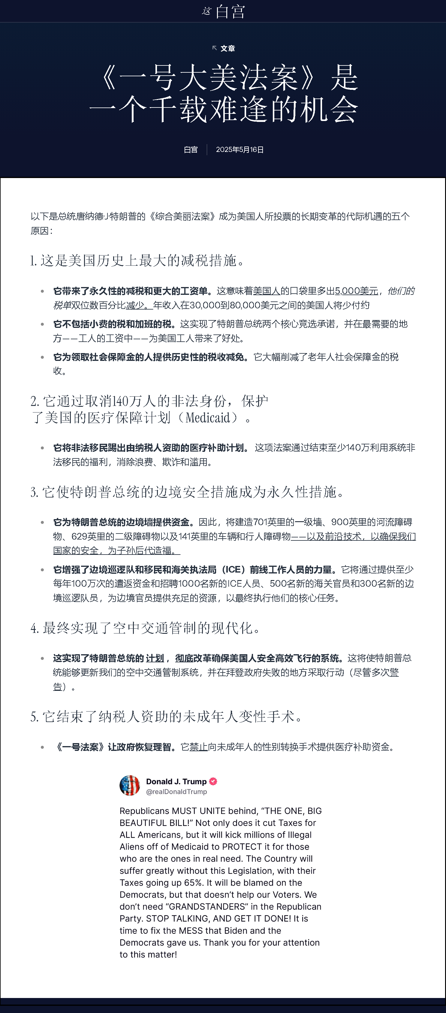 上月,美國(guó)共和黨人占據(jù)多數(shù)的國(guó)會(huì)眾議院以一票優(yōu)勢(shì)艱難通過(guò)被美國(guó)總統(tǒng)特朗普稱(chēng)為“大而美”的大規(guī)模稅收與支出法案。據(jù)悉,該法案包含多項(xiàng)條款,內(nèi)容超過(guò)1000頁(yè),主要側(cè)重于減稅和削減開(kāi)支。法案將延長(zhǎng)特朗普在其第一個(gè)總統(tǒng)任期內(nèi)于2017年通過(guò)的企業(yè)和個(gè)人減稅措施,對(duì)小費(fèi)、汽車(chē)貸款等提供新的稅收減免,同時(shí)增加國(guó)防支出,并為打擊非法移民提供更多資金。