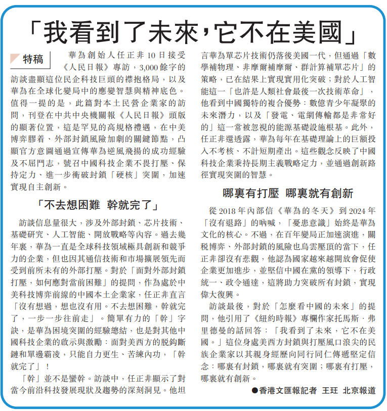 訪談最后,對于「怎么看中國的未來」的提問,他引用了《紐約時報》專欄作家托馬斯·弗里德曼的話回答:「我看到了未來,它不在美國。」這位身處美西方封鎖與打壓風口浪尖的民族企業(yè)家以其親身經(jīng)歷向同行同仁傳遞堅定信念:哪里有封鎖,哪里就有突圍;哪里有打壓,哪里就有創(chuàng)新。