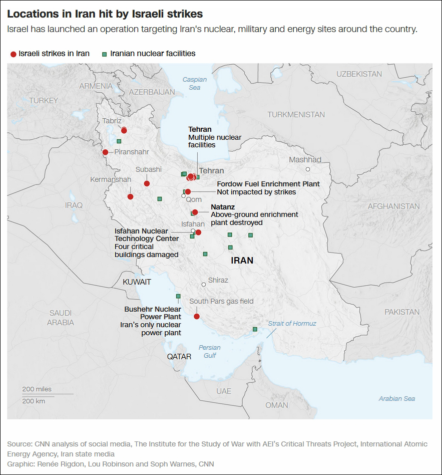 伊朗境內(nèi)受到以色列空襲打擊的地點(diǎn) CNN制圖