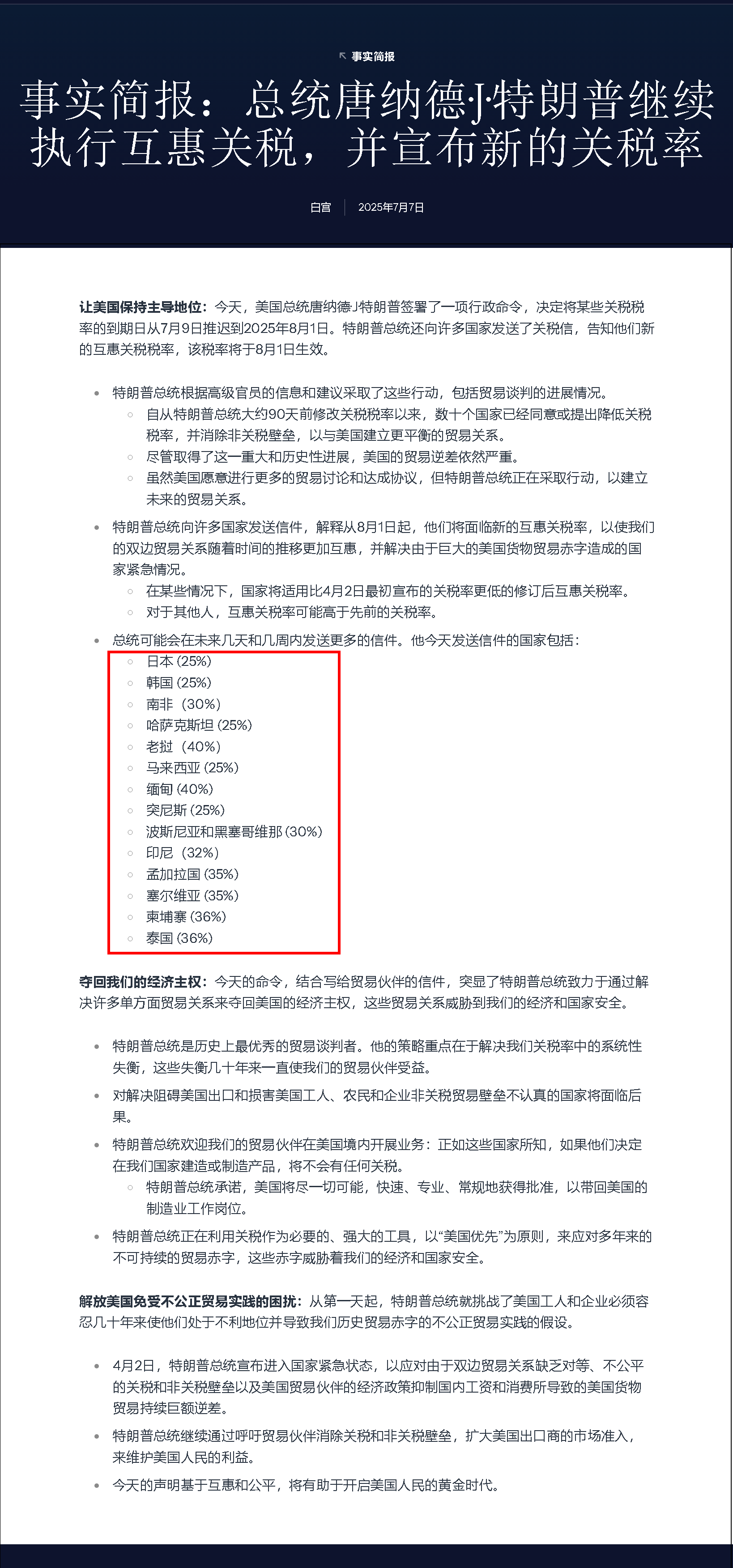 根據(jù)這些信的內(nèi)容,日本、韓國(guó)、馬來西亞、突尼斯、哈薩克斯坦將被征收25%的關(guān)稅,南非和波黑將被征收30%的關(guān)稅,印度尼西亞將被征收32%的關(guān)稅,塞爾維亞和孟加拉國(guó)將被征收35%的關(guān)稅,泰國(guó)和柬埔寨將被征收36%的關(guān)稅,老撾和緬甸則面臨高達(dá)40%的關(guān)稅。