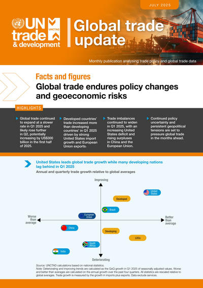 新華社日內(nèi)瓦7月8日電(記者焦倩)聯(lián)合國(guó)貿(mào)易和發(fā)展會(huì)議(貿(mào)發(fā)會(huì)議)8日發(fā)布報(bào)告稱,盡管今年上半年全球貿(mào)易預(yù)計(jì)增長(zhǎng)3000億美元,但受美國(guó)貿(mào)易政策不確定性以及全球地緣政治緊張等因素影響,今年下半年全球貿(mào)易將面臨越來(lái)越大的阻力,不確定性增大。
