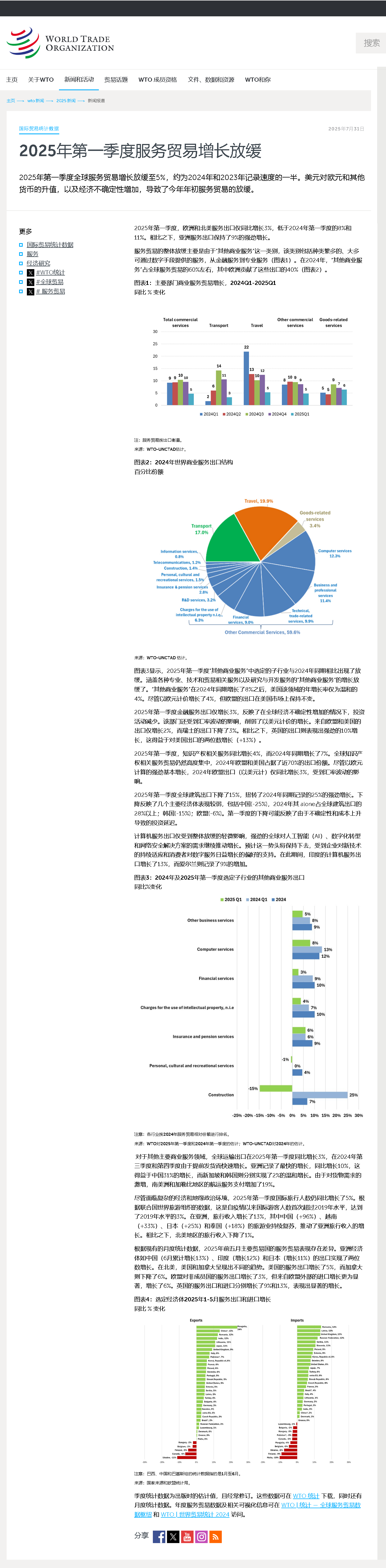 當?shù)貢r間7月31日,世貿(mào)組織發(fā)布最新數(shù)據(jù)顯示,2025年第一季度,全球服務(wù)貿(mào)易增速放緩至同比增長5%,約為2024年和2023年增速的一半。