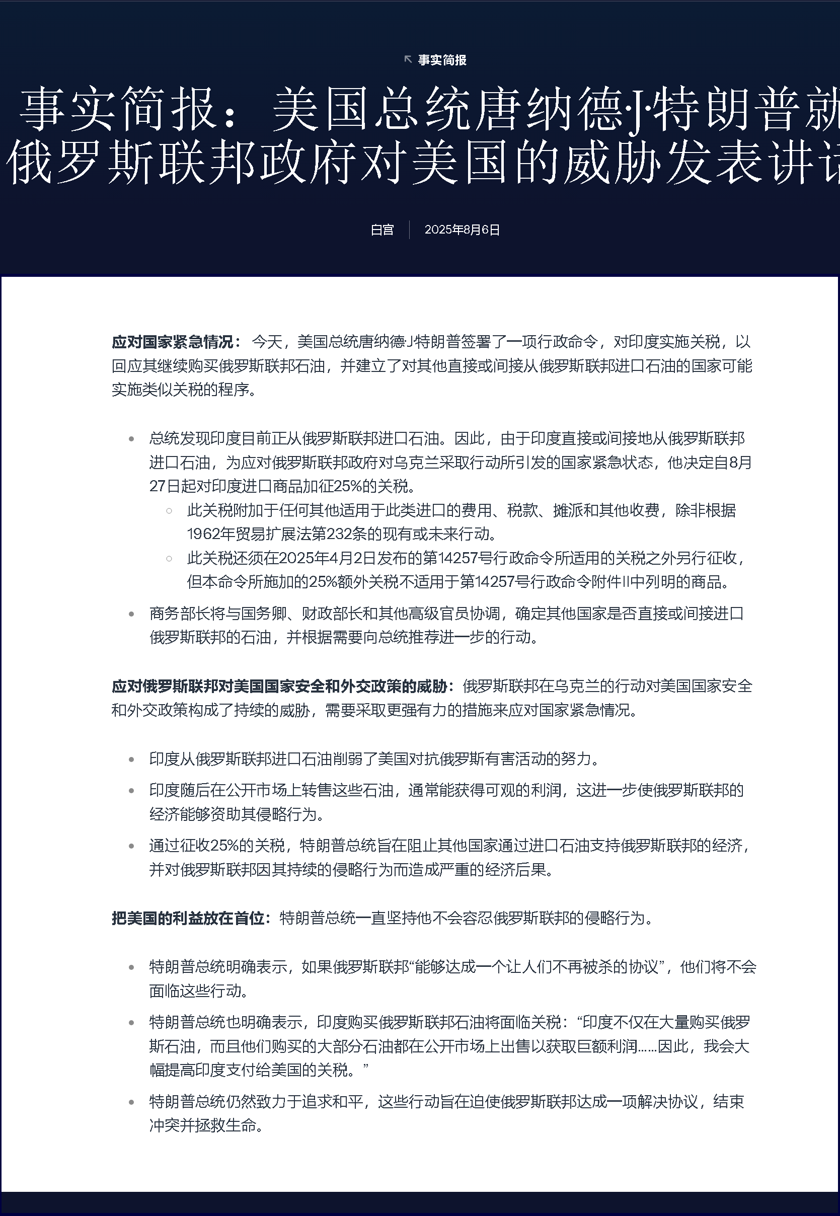 應(yīng)對國家緊急情況: 今天,美國總統(tǒng)唐納德·J·特朗普簽署了一項(xiàng)行政命令,對印度實(shí)施關(guān)稅,以回應(yīng)其繼續(xù)購買俄羅斯聯(lián)邦石油,并建立了對其他直接或間接從俄羅斯聯(lián)邦進(jìn)口石油的國家可能實(shí)施類似關(guān)稅的程序。