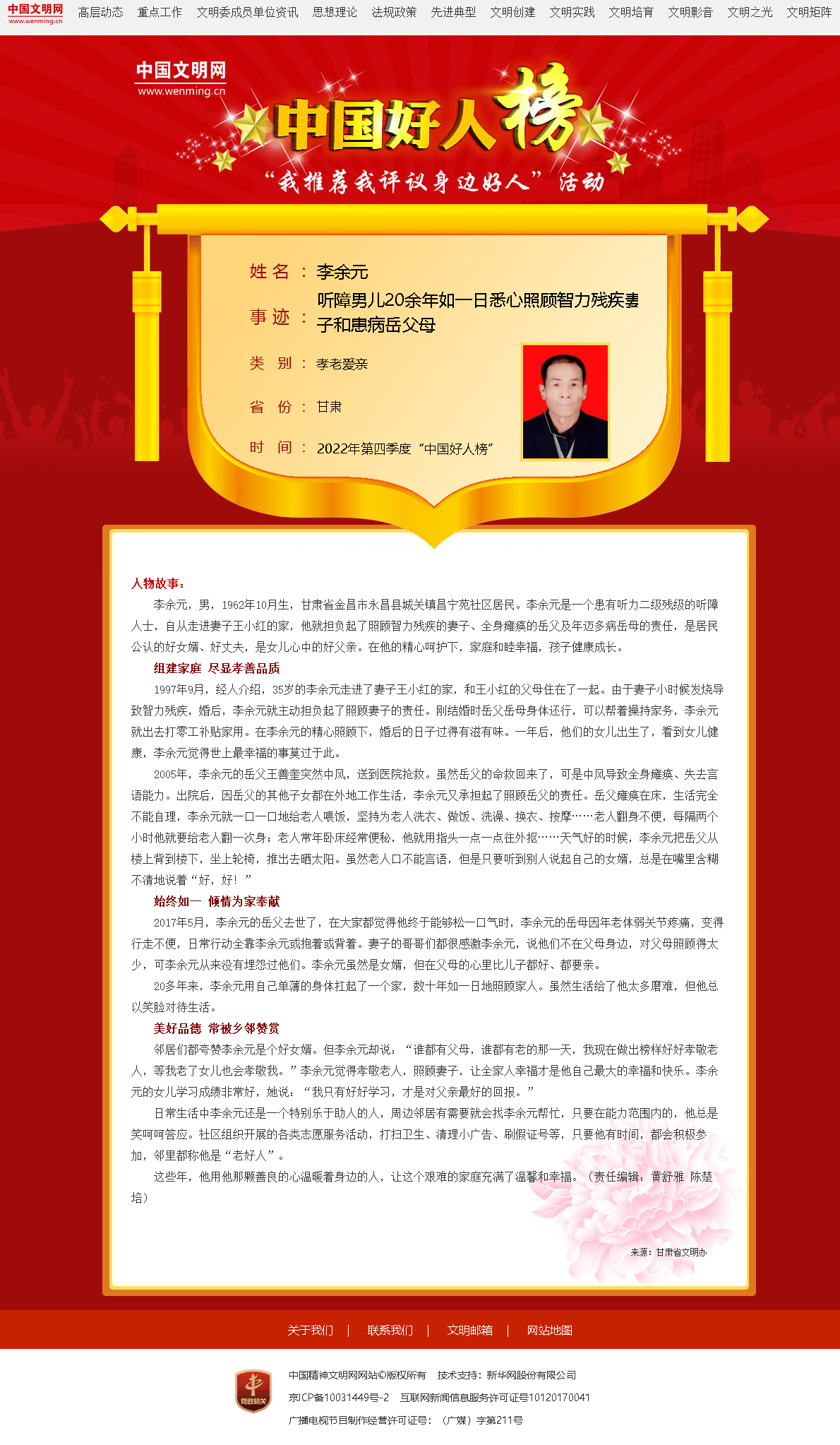 這個(gè)人叫李余元。27歲時(shí),一場意外讓他失去了聽力,被診斷為終身聽力二級(jí)殘疾。35歲時(shí),經(jīng)人介紹,李余元和有智力殘疾的王小紅組建了家庭,他擔(dān)負(fù)起照顧妻子的責(zé)任。在他的精心呵護(hù)下,家庭和睦幸福,孩子健康成長。2022年,他榮登第四季度“中國好人榜”。