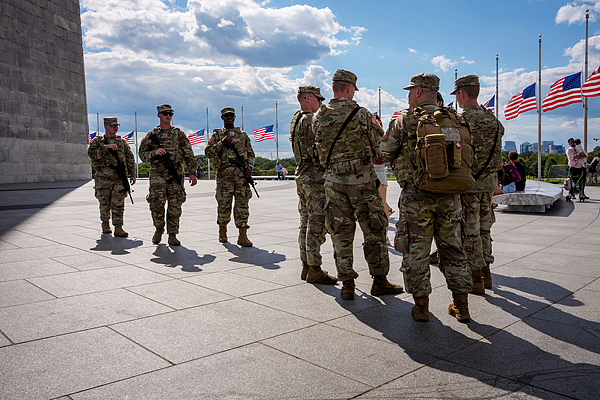8月27日,美國(guó)華盛頓,武裝國(guó)民警衛(wèi)隊(duì)成員在華盛頓紀(jì)念碑底部巡邏。 視覺中國(guó)