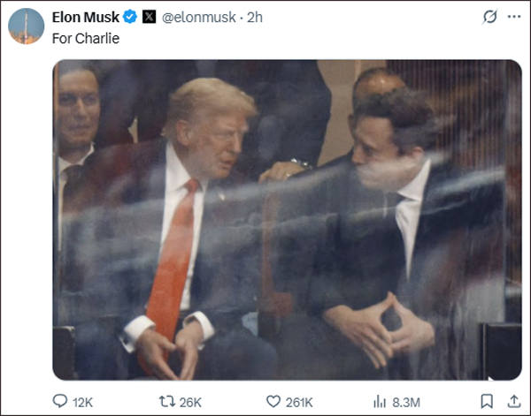 公開(kāi)鬧翻幾個(gè)月后,美國(guó)總統(tǒng)特朗普與知名企業(yè)家馬斯克于9月21日在查理·柯克追悼會(huì)現(xiàn)場(chǎng)同框亮相,兩人相鄰而坐并握手交談。