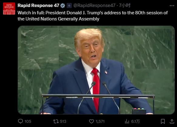 23日,特朗普在聯(lián)合國大會(huì)發(fā)表講話 推文截圖