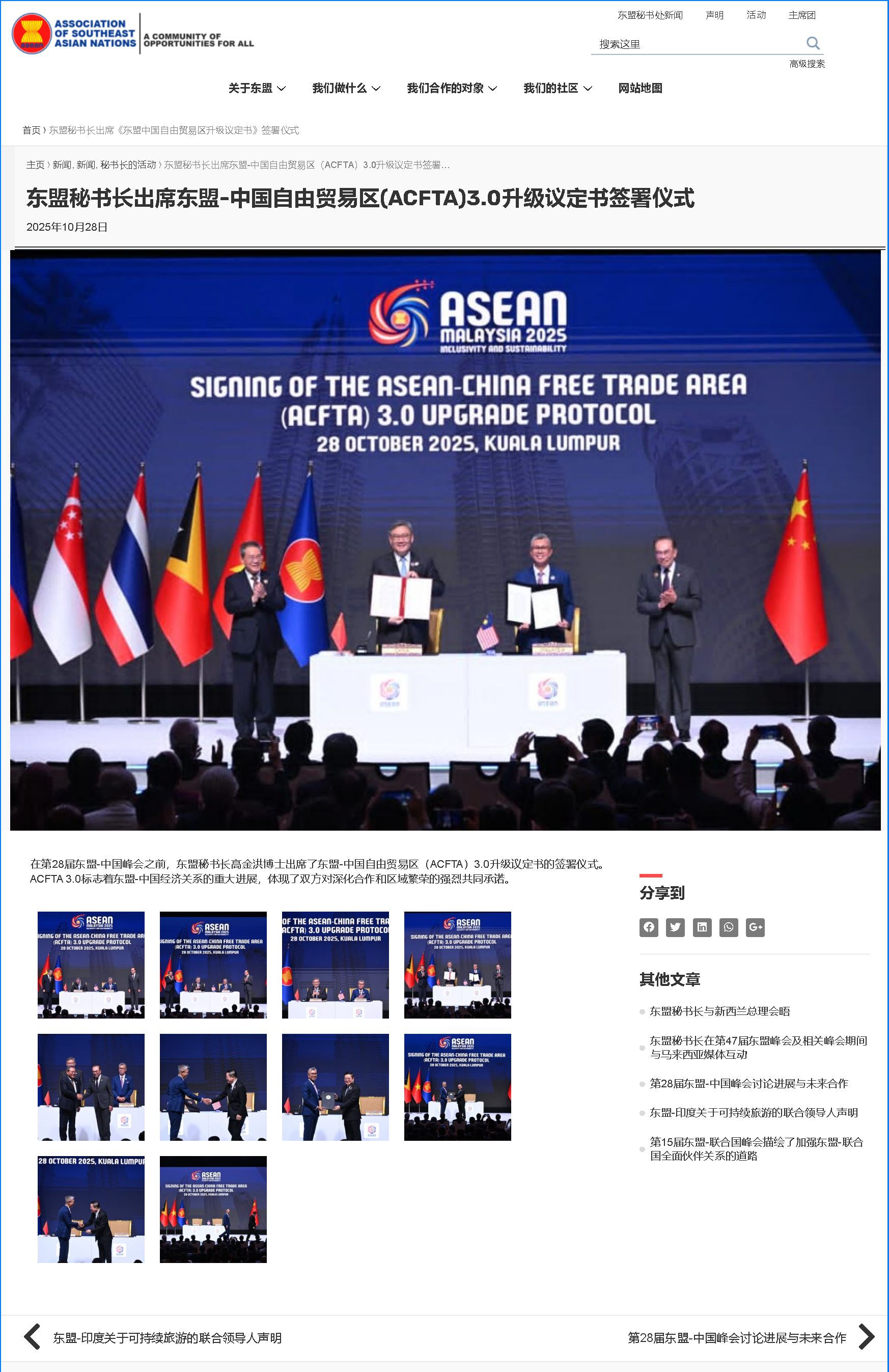 此后,雙方按照領導人指示,加緊開展個別剩余條款技術磋商及議定書文本法律審核等后續(xù)工作。經(jīng)過4次特別聯(lián)委會及多輪工作組磋商,雙方于2025年5月全面完成3.0版談判。2025年10月28日,雙方在馬來西亞吉隆坡召開的第28次中國—東盟領導人會議期間,正式簽署3.0版升級議定書。