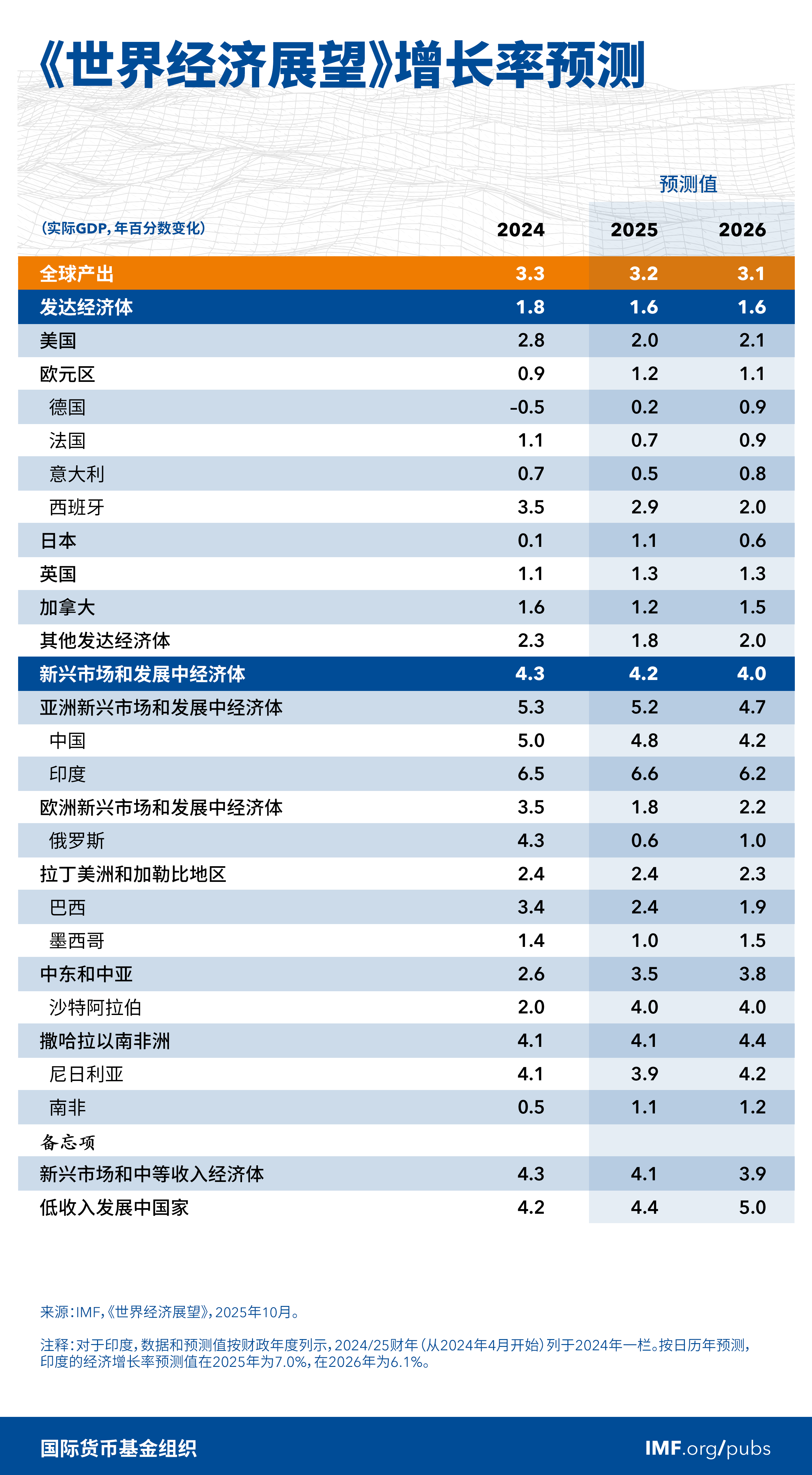 因此,最新一期《世界經(jīng)濟展望》中的全球經(jīng)濟增速預(yù)測值高于2025年4月《世界經(jīng)濟展望》的預(yù)測,但仍低于政策轉(zhuǎn)變前的預(yù)測。預(yù)計全球經(jīng)濟增速將從2024年的3.3%下降到2025年的3.2%和2026年的3.1%,其中發(fā)達經(jīng)濟體的增速約為1.5%,新興市場和發(fā)展中經(jīng)濟體則略高于4%。預(yù)計全球通脹率將繼續(xù)下降,但各國之間存在差異:美國通脹將高于目標水平,且風(fēng)險偏向上行;而其他國家通脹將處于低位。