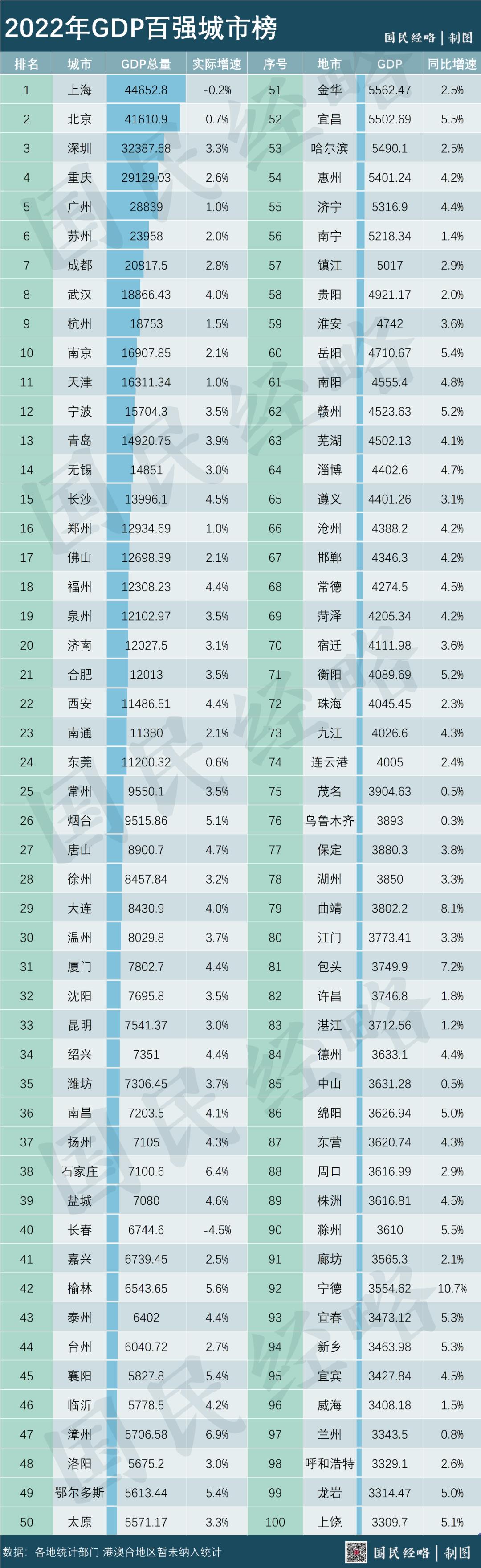 2022年GDP百強(qiáng)城市榜單近日出爐。受到疫情等超預(yù)期因素沖擊,過去一年中百強(qiáng)城市大洗牌,36座城市排名下降。以5571.17億元的GDP總量,我市排在第50位,位次保持不變。