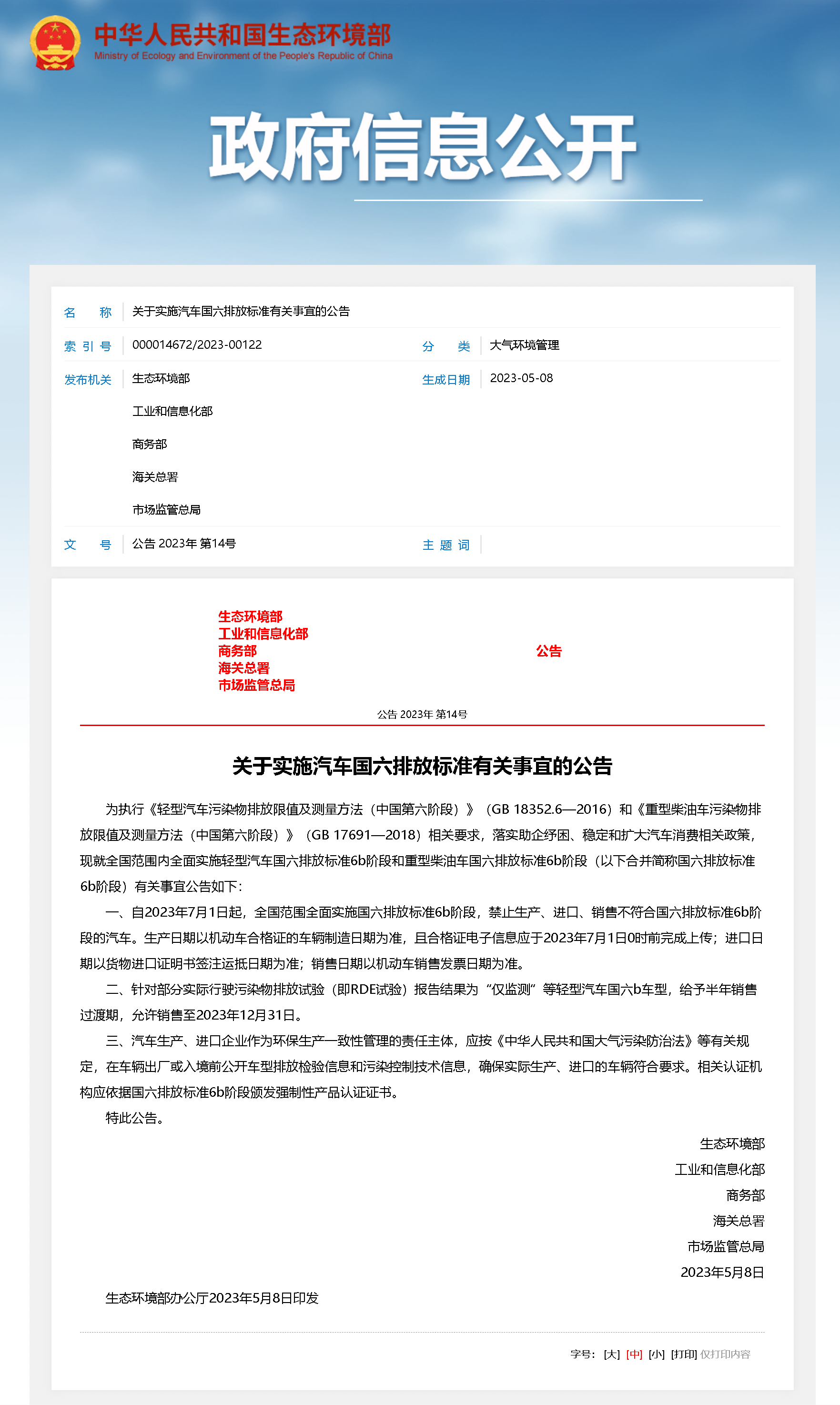 根據(jù)生態(tài)環(huán)境部、工信部、商務(wù)部、海關(guān)總署、市場監(jiān)管總局日前聯(lián)合發(fā)布的公告,本次汽車排放標準提升包括輕型汽車和重型柴油車。生產(chǎn)日期以機動車合格證的車輛制造日期為準,且合格證電子信息應(yīng)于2023年7月1日0時前完成上傳;進口日期以貨物進口證明書簽注運抵日期為準;銷售日期以機動車銷售發(fā)票日期為準。