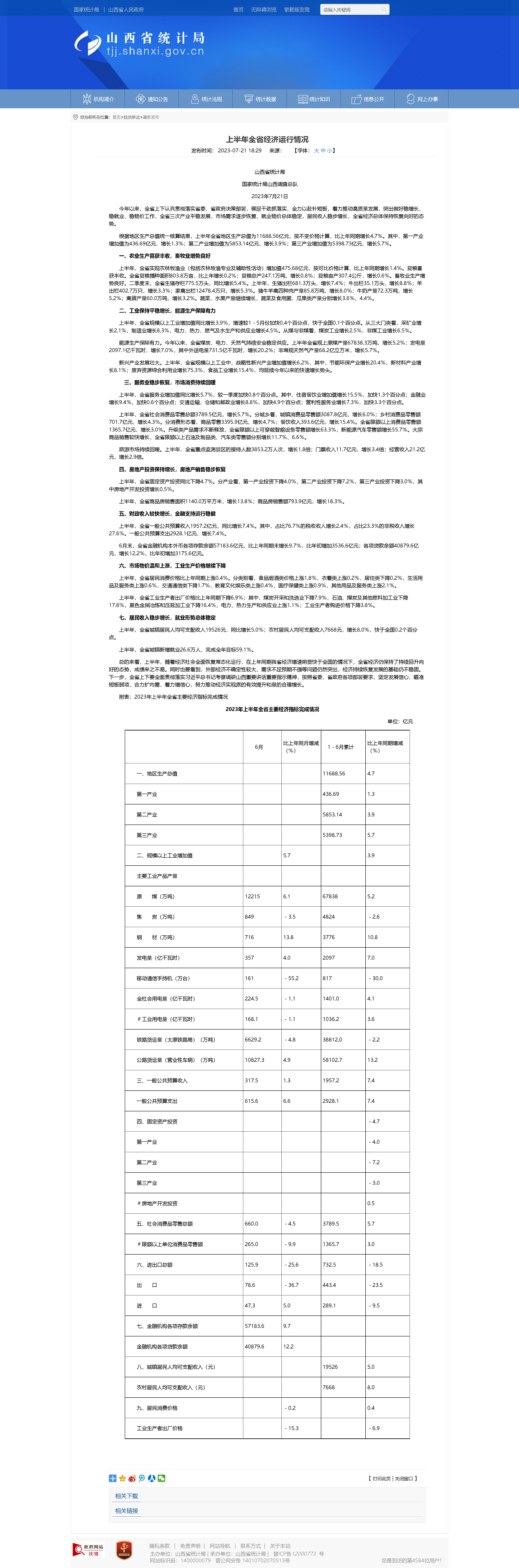 總體來看,上半年山西省地區(qū)生產總值為11688.56億元,按不變價格計算,比上年同期增長4.7%。其中,第一產業(yè)增加值為436.69億元,增長1.3%;第二產業(yè)增加值為5853.14億元,增長3.9%;第三產業(yè)增加值為5398.73億元,增長5.7%。