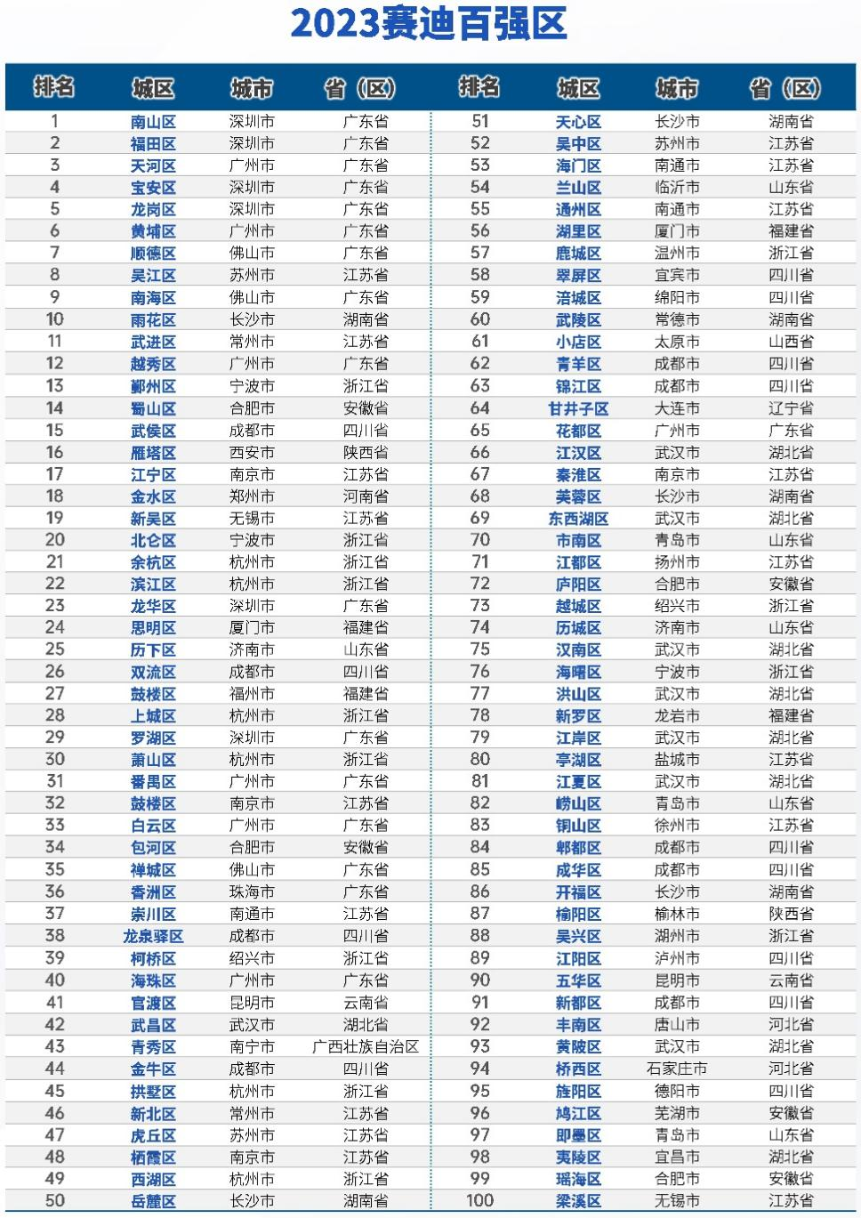 中國經(jīng)濟網(wǎng)北京8月9日訊(記者 李方) 城區(qū)是推動中國式現(xiàn)代化建設(shè)的“排頭兵”和“主戰(zhàn)場”。賽迪顧問8日發(fā)布研究顯示,在2023年賽迪百強區(qū)中,深圳南山區(qū)、深圳福田區(qū)、廣州天河區(qū)、深圳寶安區(qū)、深圳龍崗區(qū)、廣州黃埔區(qū)、佛山順德區(qū)、蘇州吳江區(qū)、佛山南海區(qū)和長沙雨花區(qū)位列2023年賽迪百強區(qū)前“十強”。