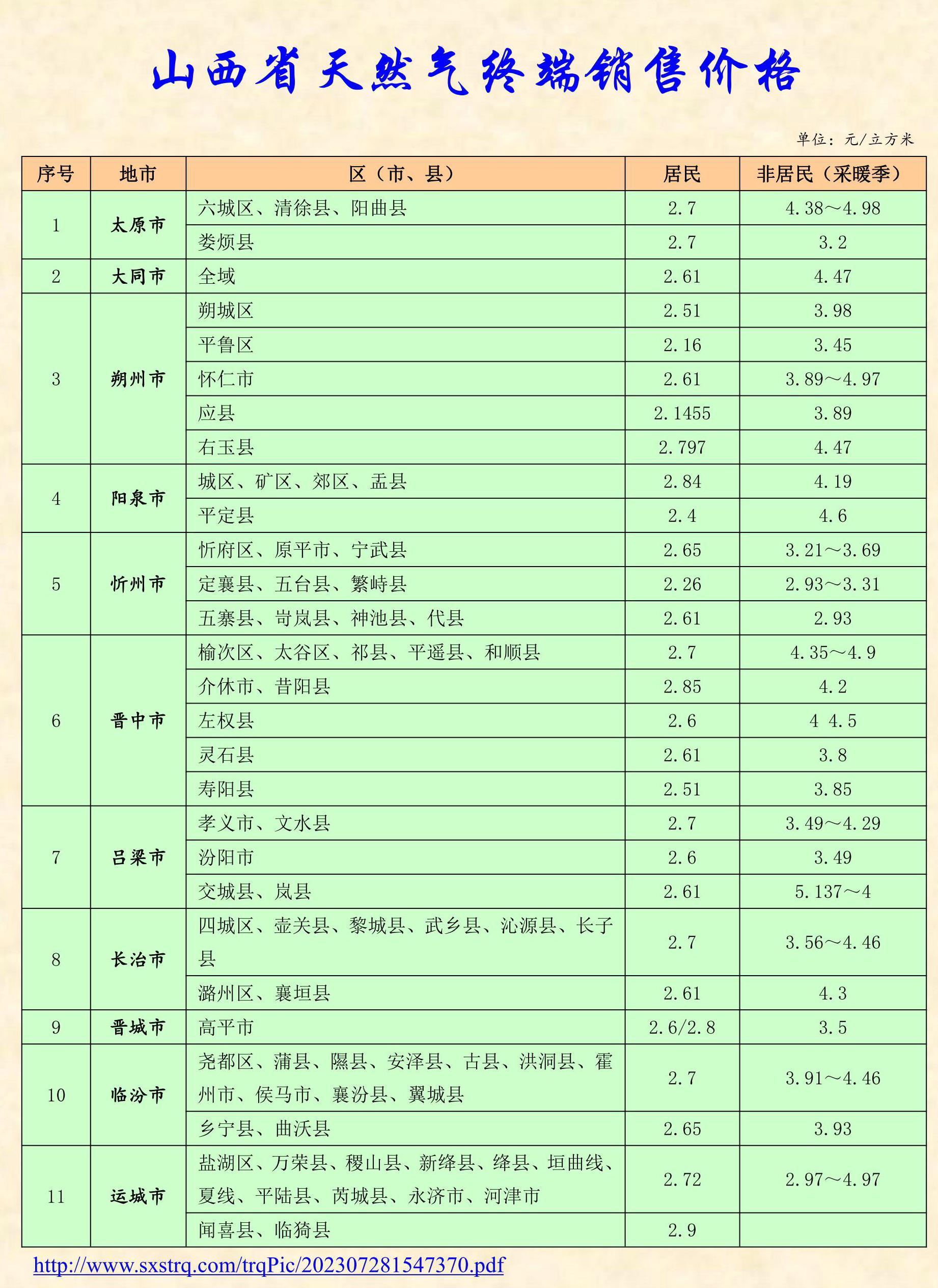 第一檔用氣 0~26(含)m3 2.61元 /m3太原市發(fā)展和改革委員會(huì) 并發(fā)改商品字[2019] 144號(hào)