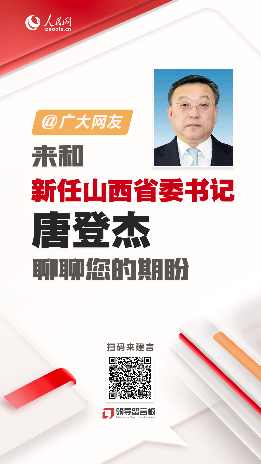 目前,不少群眾已通過人民網(wǎng)“領(lǐng)導(dǎo)留言板”給唐登杰書記留言,反映自己的所思所盼,也為扎實推進(jìn)山西高質(zhì)量發(fā)展、進(jìn)一步加快美麗山西建設(shè)建言獻(xiàn)策。