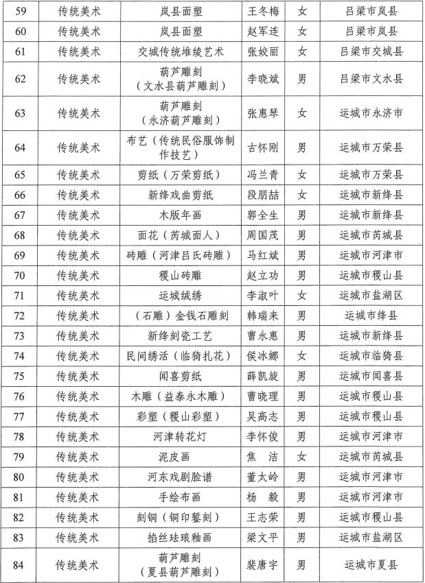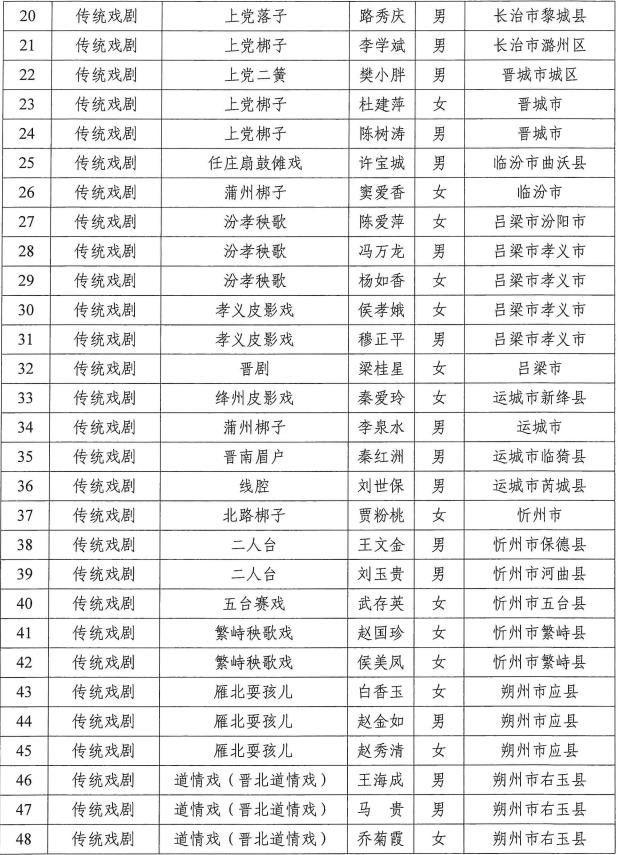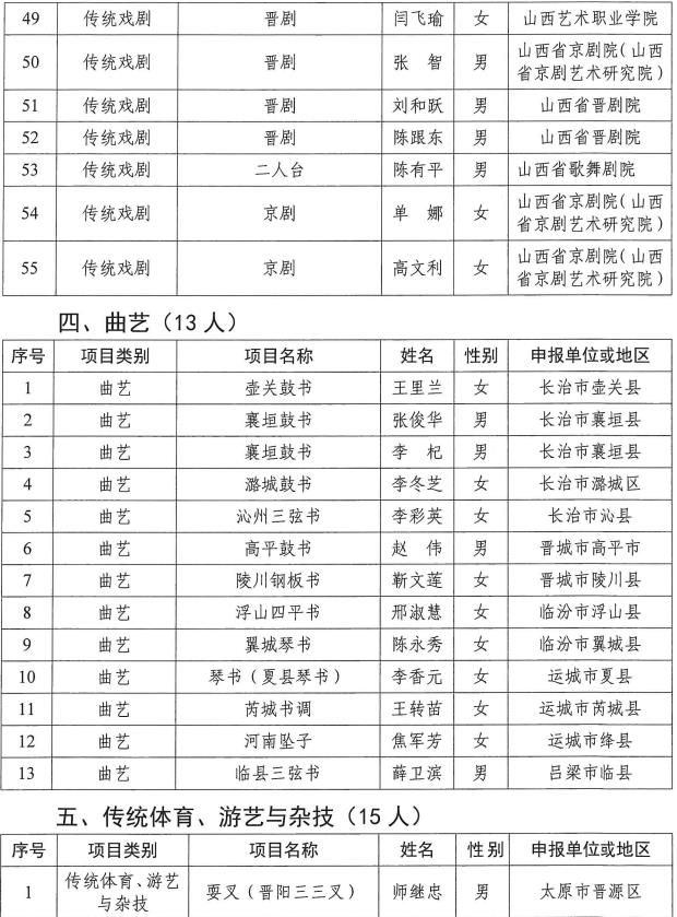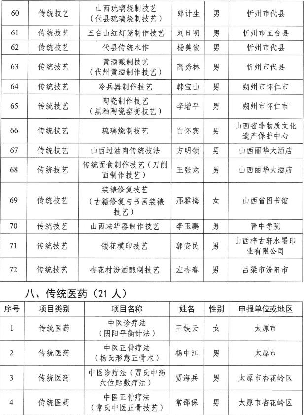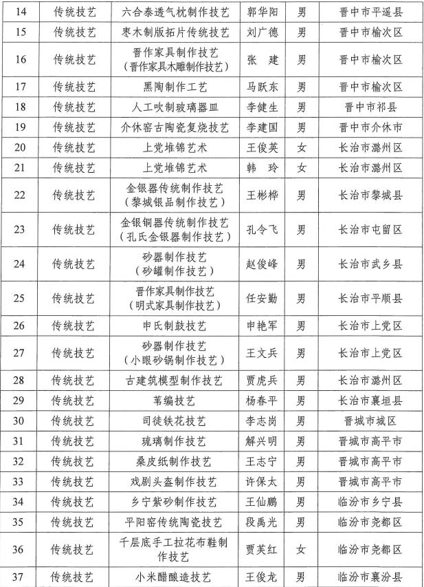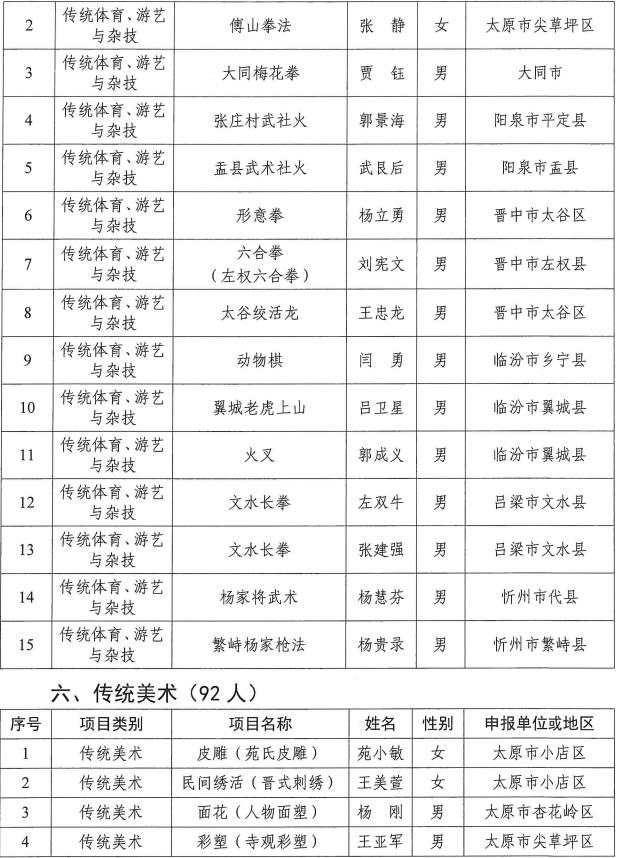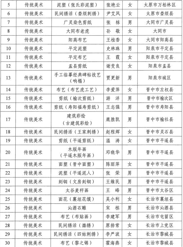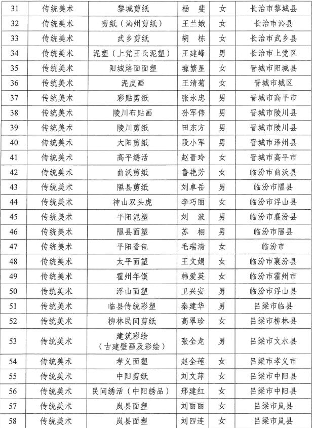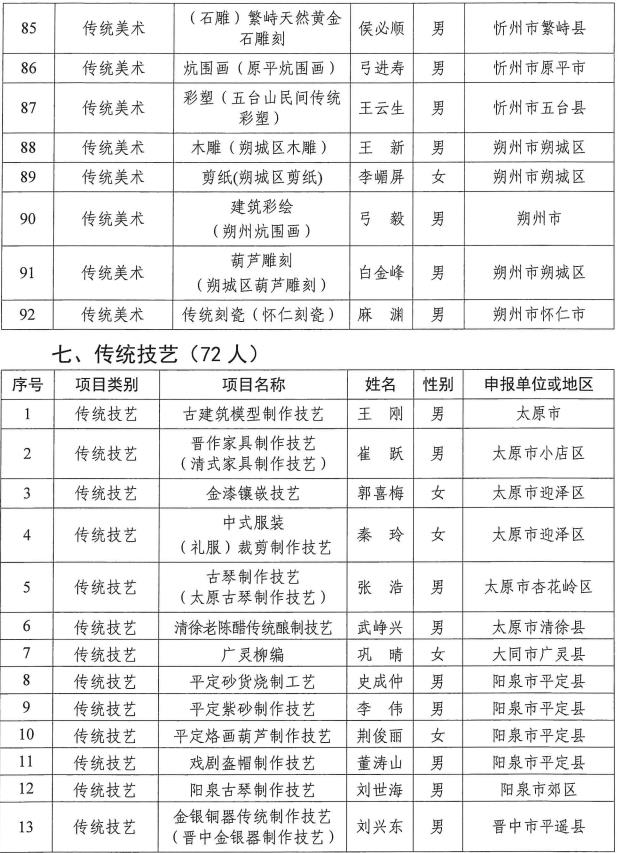 進(jìn)入第六批省級(jí)非物質(zhì)文化遺產(chǎn)代表性項(xiàng)目代表性傳承人名單的傳承人共318名,其中,傳統(tǒng)音樂(lè)類包括太原鑼鼓張愛(ài)仙、上黨八音會(huì)衛(wèi)鵬飛等27人,傳統(tǒng)舞蹈類包括渾源耍故事郭青松、左權(quán)小花戲韓永青等23人,傳統(tǒng)戲劇類包括晉劇閆耀、靈丘羅羅腔安文國(guó)等55人,曲藝類包括壺關(guān)鼓書王里蘭、陵川鋼板書靳文蓮等13人,傳統(tǒng)體育、游藝與雜技類包括大同梅花拳賈鈺、文水長(zhǎng)拳左雙牛等15人,傳統(tǒng)美術(shù)類包括廣靈染色剪紙張棟。平遙木版年畫鄧曉華等92人,傳統(tǒng)技藝類包括晉作家具制作技藝崔躍、平定紫砂制作技藝?yán)顐サ?2人,傳統(tǒng)醫(yī)藥類包括太原楊氏形意正骨術(shù)楊中江、大同泉派中醫(yī)療法李亮等21人。
