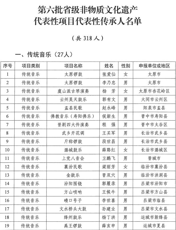 10月31日,山西省文化和旅游廳公布第六批省級(jí)非物質(zhì)文化遺產(chǎn)代表性項(xiàng)目代表性傳承人名單,318名傳承人在列,涉及傳統(tǒng)音樂(lè),傳統(tǒng)舞蹈,傳統(tǒng)戲劇,曲藝,傳統(tǒng)體育、游藝與雜技,傳統(tǒng)美術(shù),傳統(tǒng)技藝,傳統(tǒng)醫(yī)藥8大類。